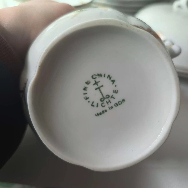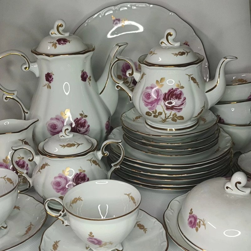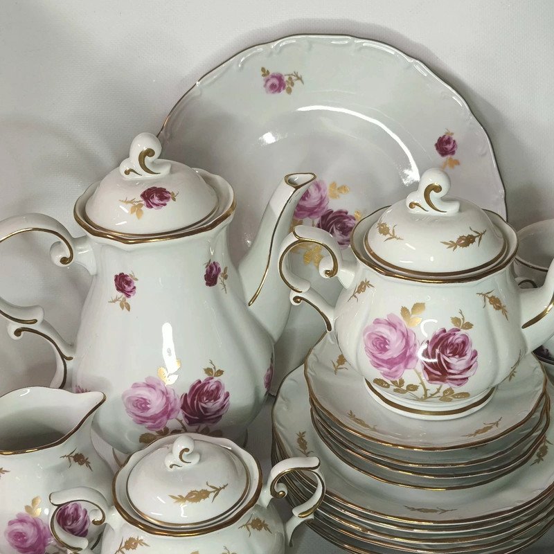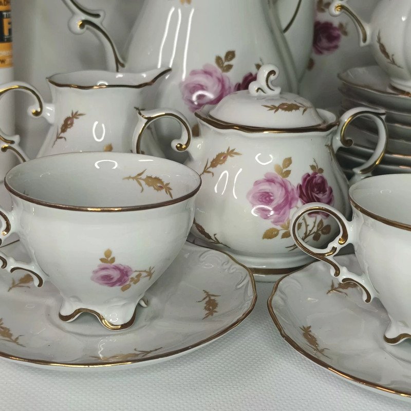 Cudnej urody, porcelanowy serwis kawowo-herbaciany, w skład którego wchodzi: