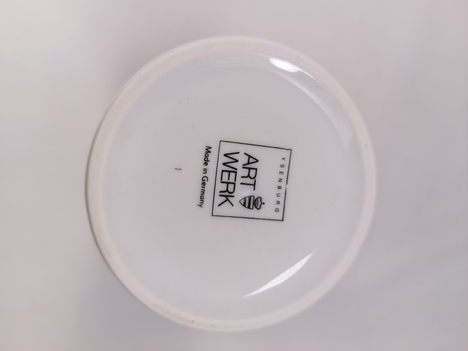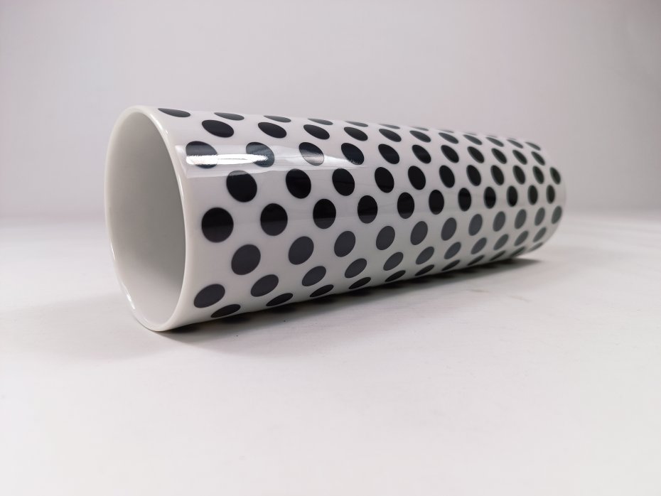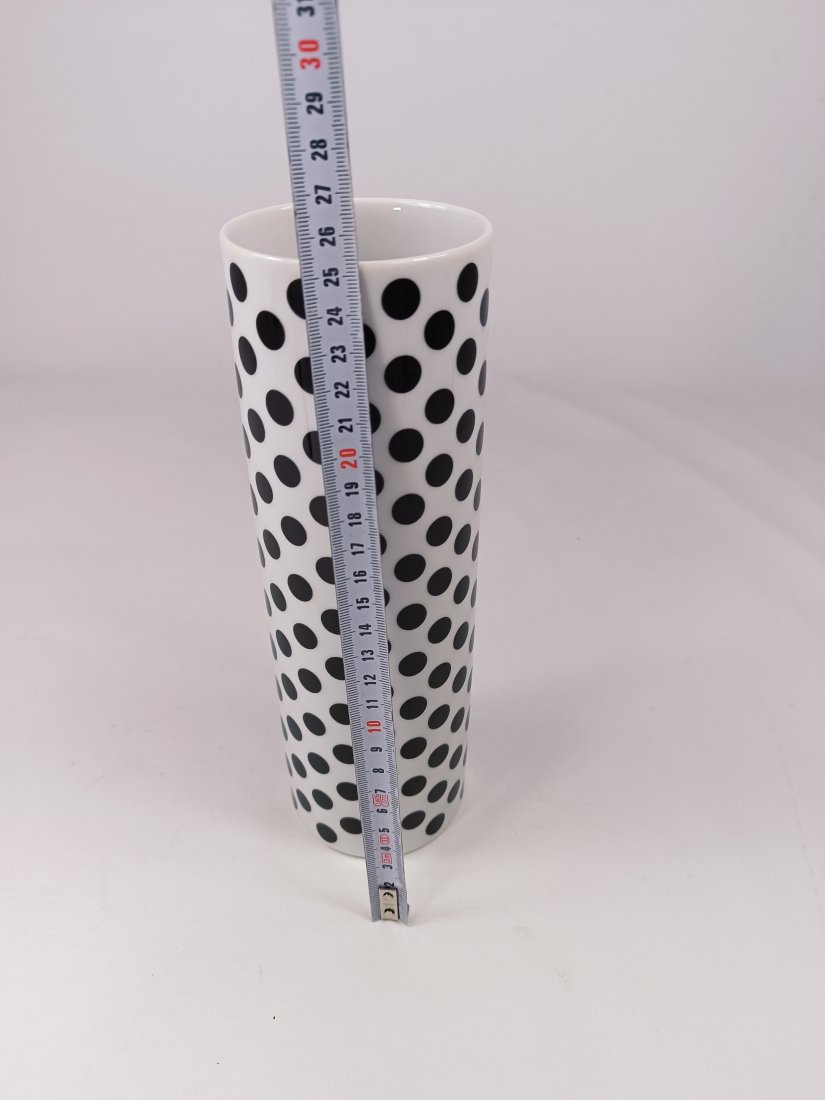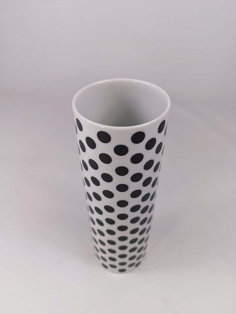 Porcelanowy wazon w kropki, sygnowany Artwerk Ysenburg, z lat 80. Stan zachowania bardzo dobry odcinek bez uszkodzeń. Wysokość 25 cm.