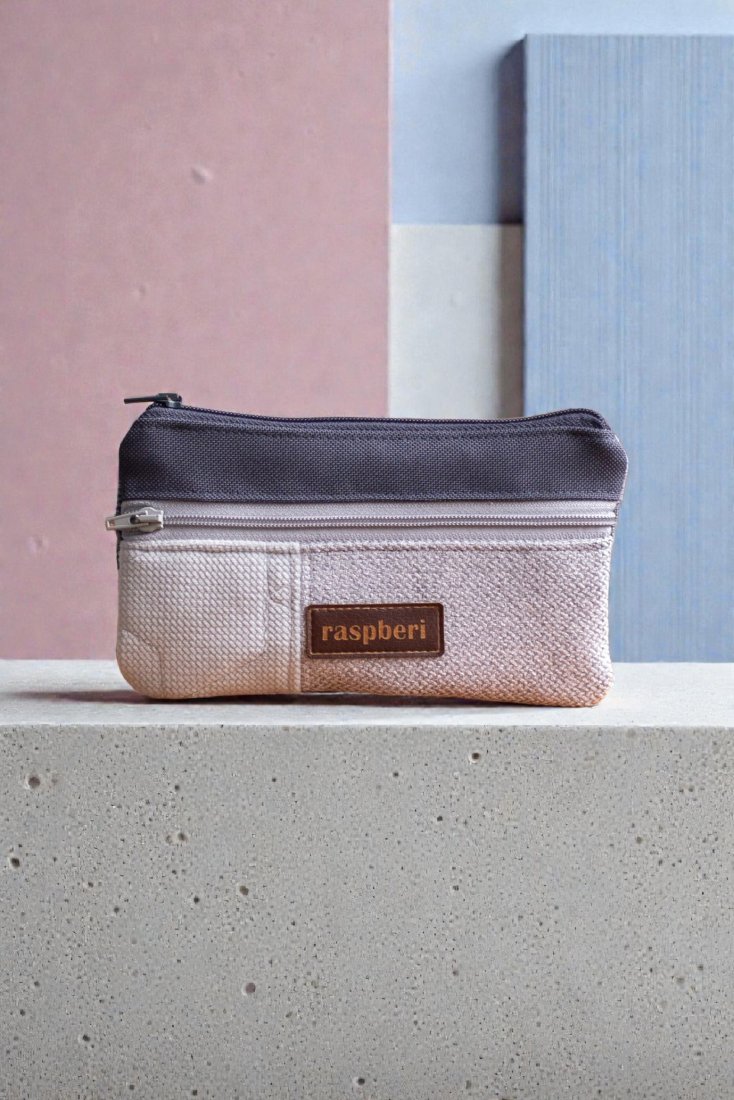 Prosty wodoodporny portfel wykonany z kilku rodzajów tkanin w odcieniach szarości.