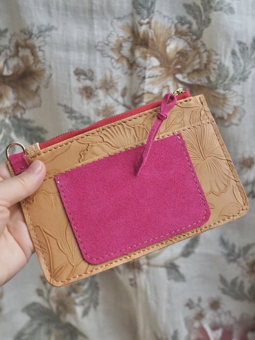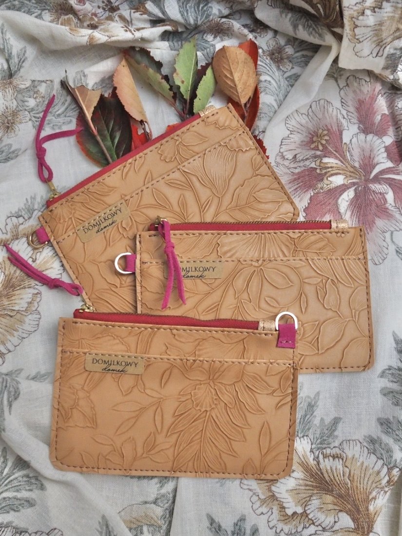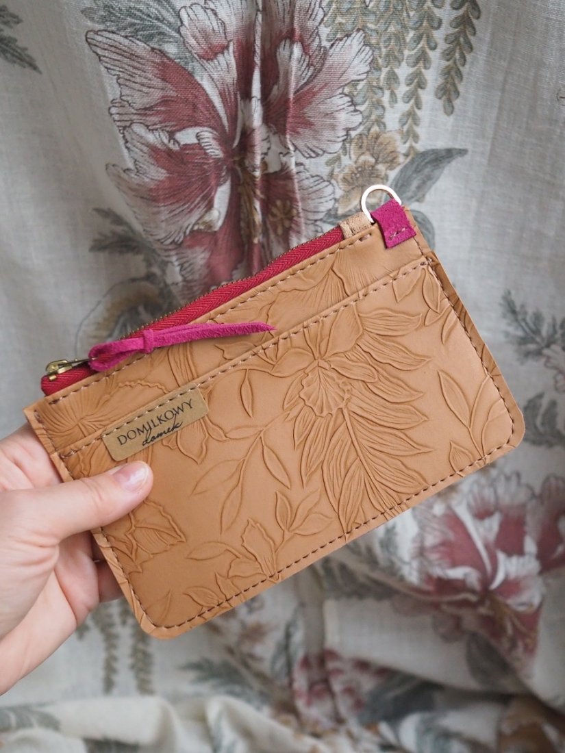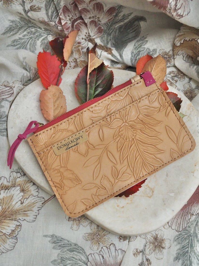 Elegancki i praktyczny portfel – saszetka handmade wykonany ze skóry ekologicznej tłoczonej w motywy kwiatowe.