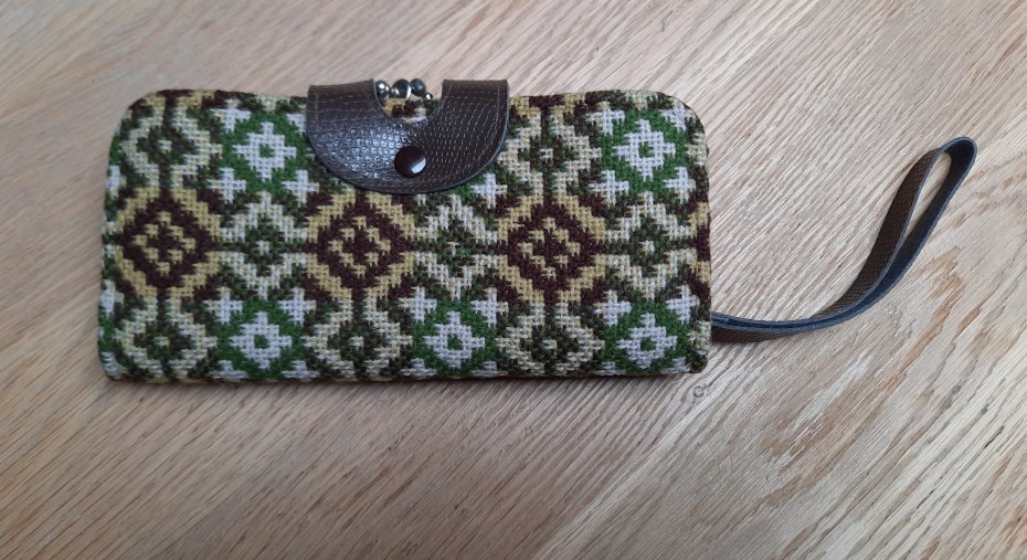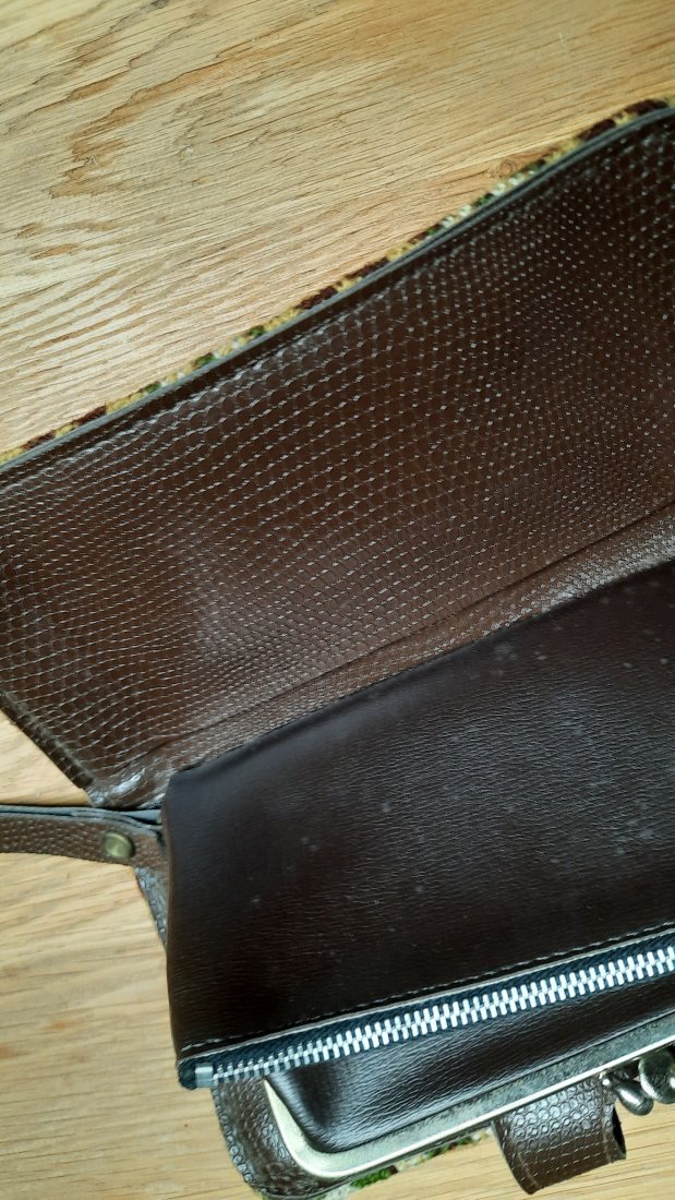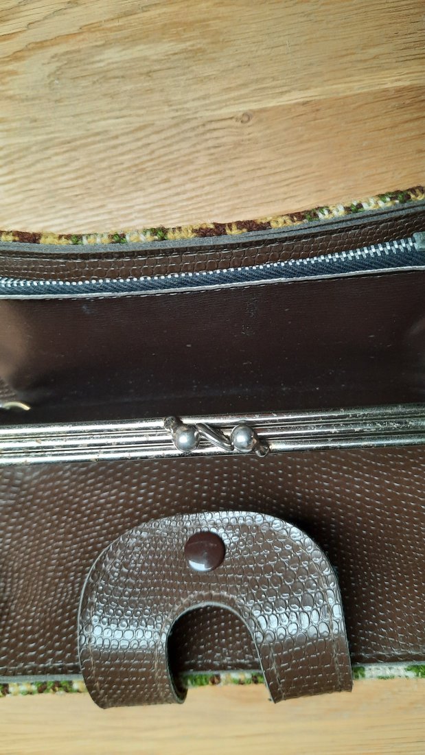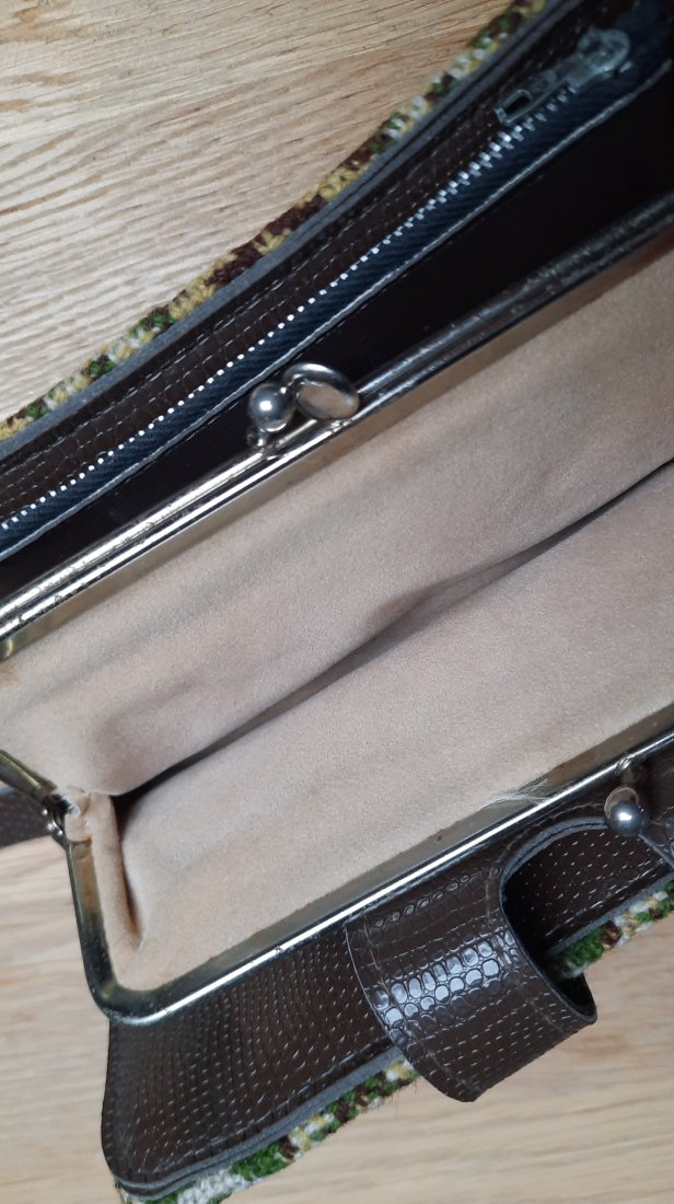 piękny wzorzysty portfel vintage z lat 60-tych wykonany z walijskiej wełny w kolorze brązowym, zielonym i beżowym, zapinany na zatrzask, wnętrze w kolorze brązowym wykonane z imitacji skóry, w środku dwie kieszonki po bokach, jedna komora zapinana na suwak oraz dwie komory zapinane na bigiel, dodatkowo portfel posiada dłuższy paseczek