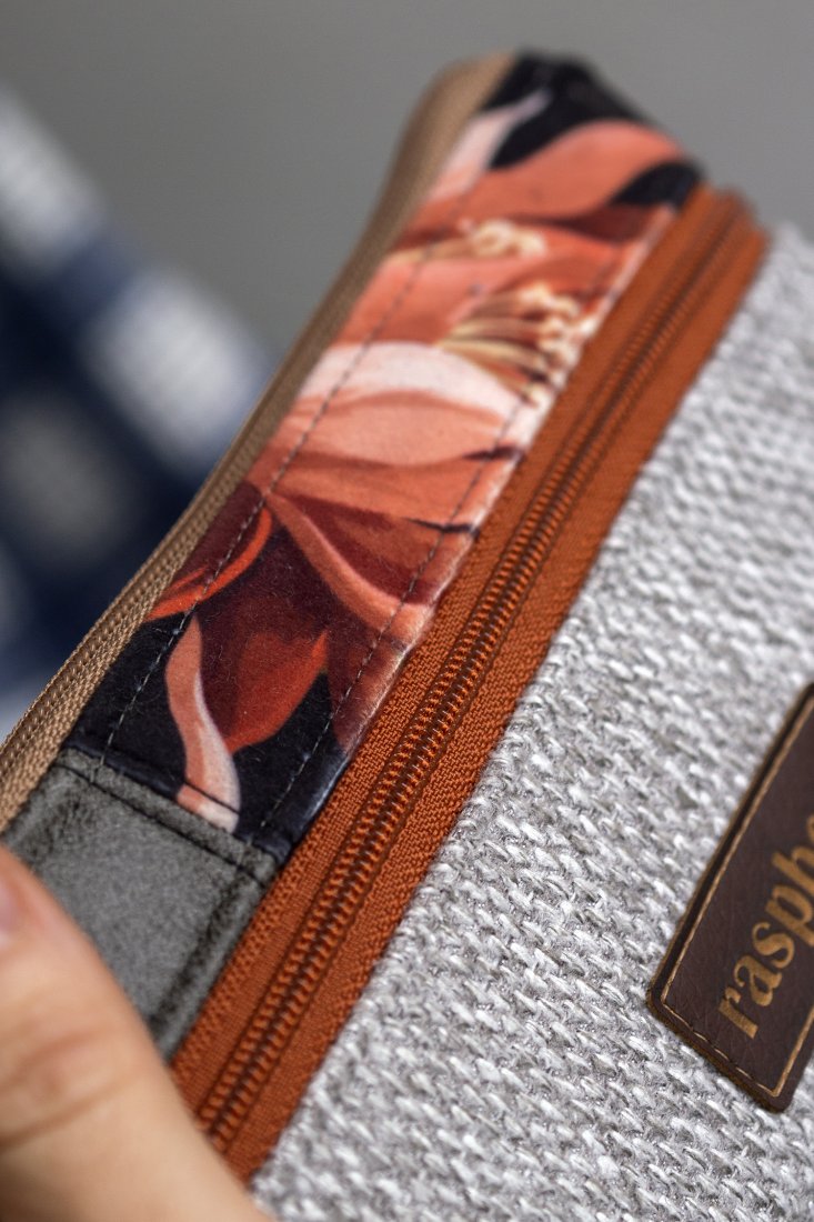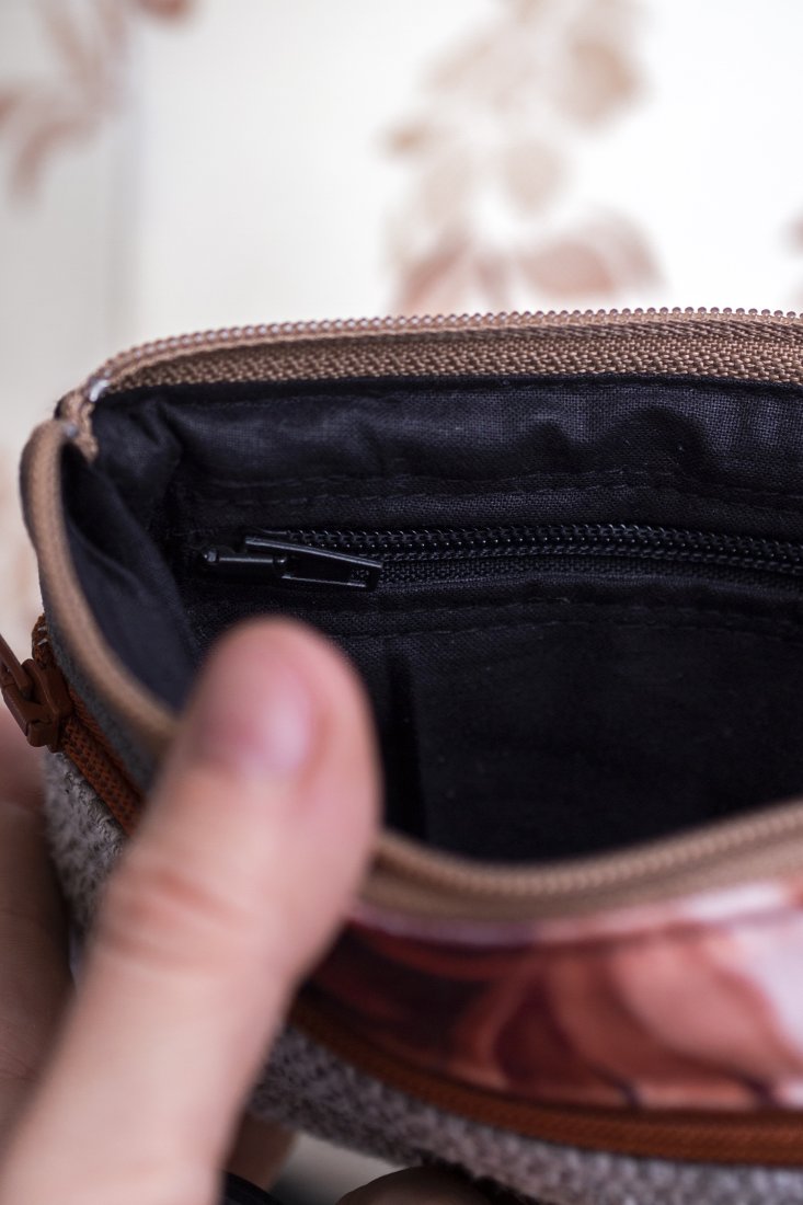Idealny na karty płatnicze oraz pieniądze. Zapinany na suwak, z przodu kieszonka na drobne, w środku bawełniana podszewka i kieszonka na suwak.