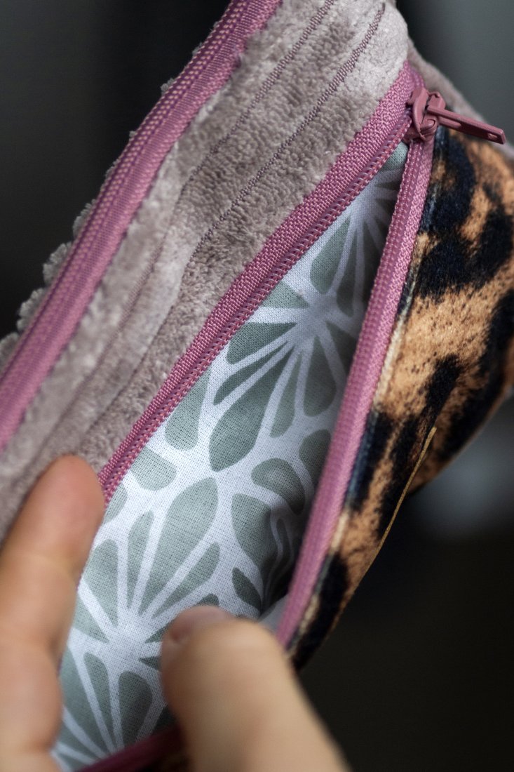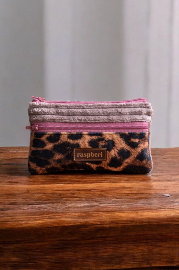Prosty wodoodporny portfel wykonany z grubego pudroworóżowego sztruksu oraz weluru w panterkę.