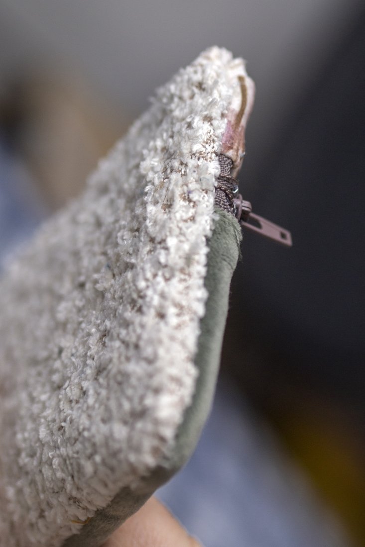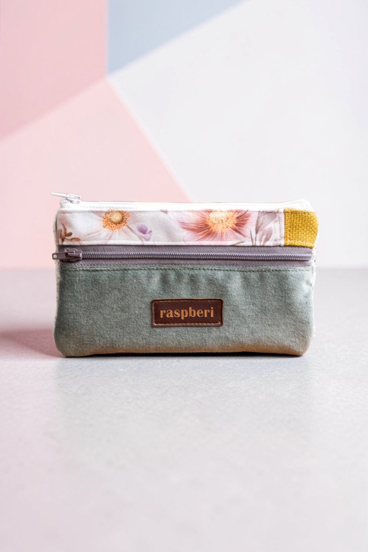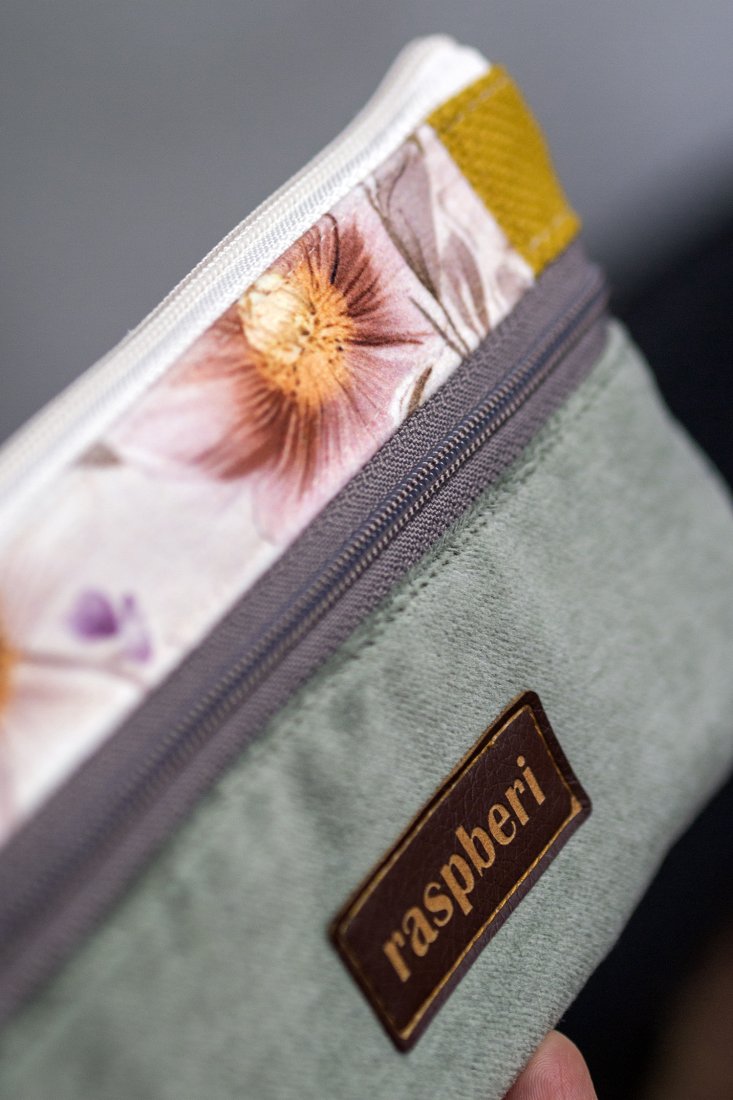 Prosty wodoodporny portfel w kolorze kremowo-laurowym w kwiaty. Tył z tkaniny typu "baranek". Bardzo wygodny w użytkowaniu i unikatowy. Jedyna taka sztuka. Stworzony w stylu no waste.