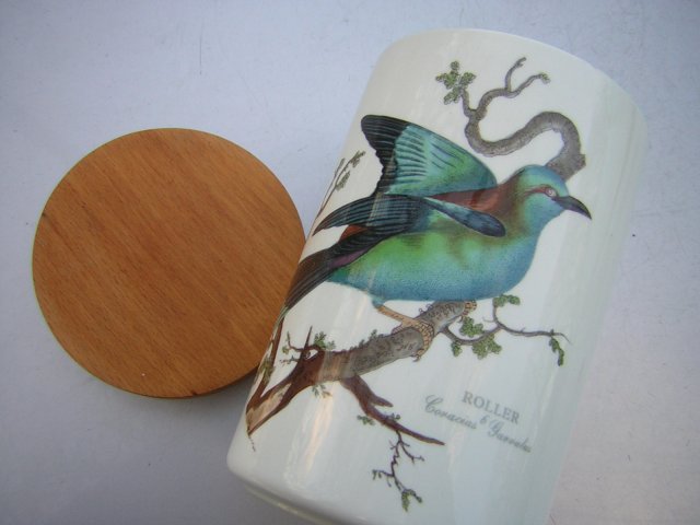 Duży pojemnik porcelanowy. Sygnowany PORTMEIRION birds of Britain 1978, dishwasher proof in głaze decorative. Made in England. Mocny, ciężki, solidny, ale porcelana dźwięcząca, szlachetna. Pojemny - kilogram się mieści. Ecru tła i piękne ptasie zdobienie. Dawna edycja. Drewniana zatyczka z gumką od spodu. Góra około 10,5 otwór 9,5 dół nie całe 9 cm , wys. Z przykrywką 18 cm , bez. 16 cm