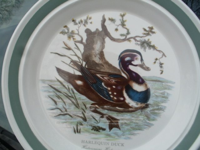 Duży 26 cm średnicy porcelanowy półgłęboki półmisek - talerz . Dawna edycja z 1978 roku. Rarytas na rynku polskim. Użytkowy I kolekcjonerski , dekoracyjny I oryginalny. Porcelana mocna, solidna , dźwięczna... dość ciężka. Sygnowany "Portmeirion birds of britain Susan Williams Ellis 1978 dishwasher proof inglaze decoration". Stonowane barwy podszkliwnego zdobienia , tu "harlequin DUCK " . Wykończenie satynowo - błyszczące. Góra 26 cm dół 18 wys. Około 3 cm Stan zachowania - bez pęknięć I uszczerbków. Ślady użytkowania np. Ślady po widelcu, skraklowane szkliwo.