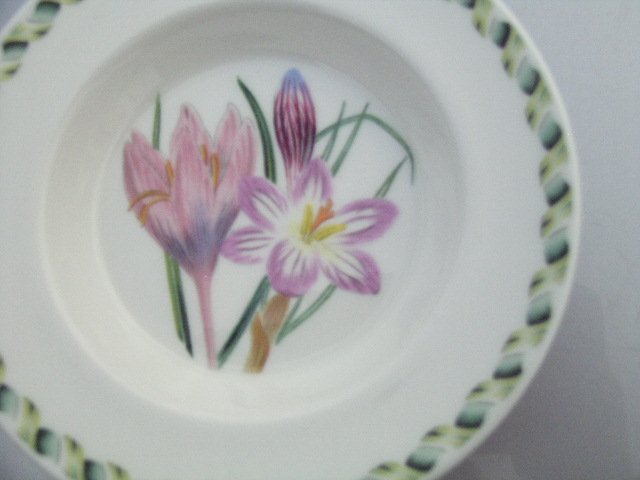 Talerzyk Porcelanowy sygnowany PORTMEIRION China z rzadko spotykanej serii z 1994 roku LADIES FLOWER GARDEN Jane Loudon's z kultowymi botanicznymi zdobieniami wg Susan Williams-Ellis. Najwyższa jakość grubej, solidnej, szlachetnej porcelany w ciepłej bieli..Ciekawa forma - półmiseczk Sztuka stołu bardzo efektowna i z klasą :) Fantastyczne zdobienie - krokusy jak żywe i ciekawy - nieco inny niż w serii Pomona,cz też Botanic Garden szlaczek na rancie. Inna jest też sygnatura. Kolory żywe,miłe dla oka. Wykończenie błyszczące. Rarsytas na rynku polskim i nie tylko :)
