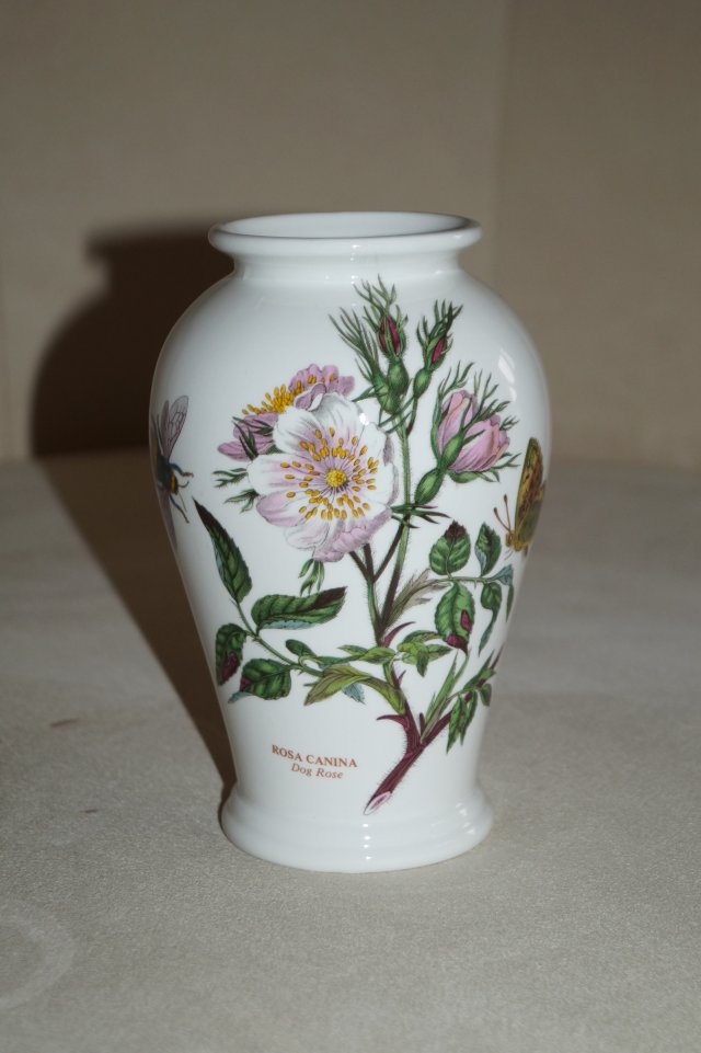 Kolekcjonerski porcelanowy wazon sygnowany PORTMEIRION z serii BOTANIC GARDEN Made in England, porcelana w kolorze ciepłej bieli pięknie zdobiona charakterystycznym motywem roślinnym ( ROSA CANINA) , szkliwiona na błyszcząco