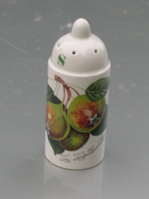Porcelanowa solniczka PORTMEIRION - tutaj z serii owocowej, z pięknymi botanicznymi reprodukcjami na malaturze. Na cieplej bieli porcelany gruszki specjalnej gatunek :) Całość na błyszcząco szkliwiona. 4,5 x 10,5 cm. Od spodu plastikowa zatyczka. Stan zachowania bardzo dobry.