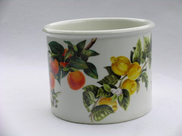 Duży porcelanowy Pojemnik sygnowany PORTMEIRION Made in England z rysunkami Susan Williams Ellis. W pełni użytkowy i przepięknie zdobiony. Mocny, szlachetny. Na cieplej bieli porcelany owocność pomorańczy i cytryn. Całość na błyszcząco szkliwiona.