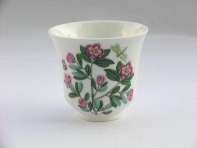 Naczynko porcelanowe, sygnowane jakością kultowej serii Portmeirion. Charakterystyczne botaniczne zdobienie rododendronowe i motyle pod błyszczącym szkliwieniem. Ciekawy kształt. Dół 3,5; góra 7,5; wys. 7 cm. Stan zachowania bardzo dobry. Do kolekcji i na prezent.