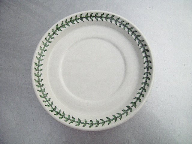 Mocna,solidna porcelana na błyszcząco szkliwiona. Ciepła biel i soczyście zielony szlaczek jak na większości / pomiąwszy może serię Pomona/ Portmeirionowych serii.:)