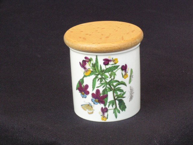 Kolejny skarb od Portmeirion, z kultowej serii Botanic Garden, ze zdobieniem autorstwa Susan Ellis; tutaj Viola Tricolor, czyli nasz Bratek :) Oczywiście w ogrodowej motyli asyście. Pojemnik porcelanowy, najwyźszej jakości, w pełni użytkowy. Na przyprawy lub do przechowywania roboczo-kuchennie przygotowanego koperku, czosnku, cebulki... Przykrywka drewniana, lakierowana, z praktycznym uszczelniającym ogumieniem. 6-7 x 7,5 cm. Stan zachowania bardzo dobry. Wartość kolekcjonerska :)
