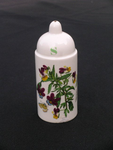 Porcelanowa solniczka z serii PORTMEIRION z rysunkami Susan Williams Ellis. Z kultowej serii BOTANIC GARDEN. Na cieplej bieli porcelany viola tricolor, czyli nasz bratek w pięknej kolorystyce i charakterystyczny motyl... Całość na błyszcząco szkliwiona. 4,5 x 10,5 cm. Od frontu widoczny uszczerbek przy dolnym rancie, bielą podmalowany, nie ujmujący jednak użytkowości. Od spodu platikowa zatyczka.