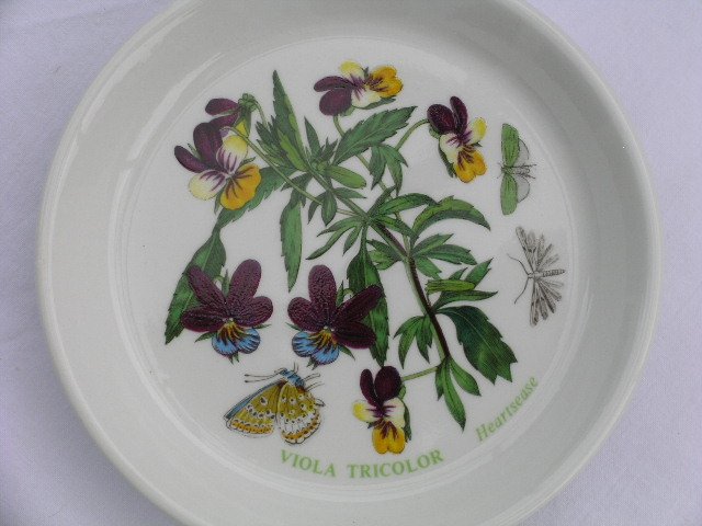 Porcelanowy talerzyk sygnowany PORTMEIRION Made in England z rysunkami Susan Williams Ellis. Z kultowej serii BOTANIC GARDEN /Dishwasher proof; oven to table; freezer & microwave safe/. W pełni użytkowy i przepięknie zdobiony. Mocny,szlachetny. Na cieplej bieli porcelany Viola Tricolor i charakterystyczny owadzi lot w przyjemnych dla oka barwach. Całość na błyszcząco szkliwiona.