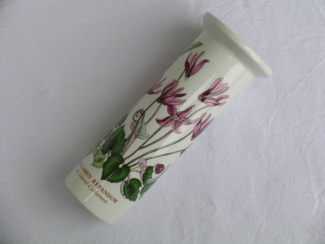 Efektowny, porcelanowy wazonik sygnowany PORTMEIRION Made in England z rysunkami Susan Williams Ellis. Z kultowej serii BOTANIC GARDEN /Dishwasher proof/. W pełni użytkowy i przepięknie zdobiony. Mocny, szlachetny. Na cieplej bieli porcelany cyklamen w pięknej kolorystyce i charakterystyczne owady... Ciekawy kształt i proporcje. Całość na błyszcząco szkliwiona. Dół 4; góra 5,5; wysokość 13,5 cm. Stan zachowania bardzo dobry. Wartość kolekcjonerska.