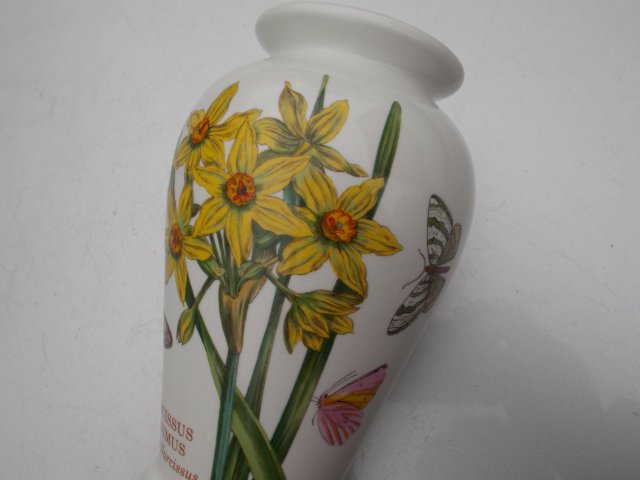 Niezwykle efektowny porcelanowy wazon sygnowany PORTMEIRION Made in England z rysunkami Susan Williams Ellis. Z kultowej serii BOTANIC GARDEN . W pełni użytkowy i przepięknie zdobiony. Mocny, szlachetny. Na cieplej bieli porcelany wiosenne żonkile i motyle w pięknej kolorystyce... Piękny kształt. Całość na błyszcząco szkliwiona.