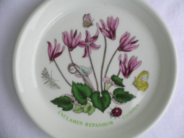 Porcelanowy talerzyk sygnowany PORTMEIRION Made in England z rysunkami Susan Williams Ellis. Z kultowej serii BOTANIC GARDEN /Dishwasher proof; oven to table; freezer & microwave safe/. W pełni użytkowy i przepięknie zdobiony. Mocny,szlachetny. Na cieplej bieli porcelany Cyclamen i charakterystyczny owadzi lot w przyjemnych dla oka barwach. Całość na błyszcząco szkliwiona.