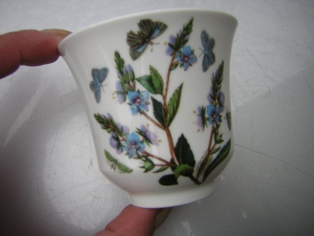 Naczynko porcelanowe , sygnowane jakością kultowej serii Portmeirion ze zdobieniami autorstwa Susan Williams Ellis. Charakterystyczne botaniczne zdobienie niezapominajkowe i motyl pod błyszczącym szkliwieniem. Ciekawy kształt. Dół 3,5; góra 7,5; wys. 7 cm.