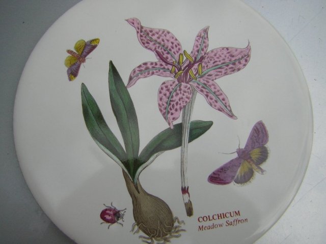 Porcelanowy Okrągły Kafel- Podstawka pod gorące / i nie tylko/ . PORTMEIRION z rysunkami Susan Williams Ellis. z kultowej serii BOTANIC GARDEN. Nie wiem , czy sygnowany - od spodu ma naklejony filcyk w kolorze zielonym .. W pełni użytkowy i przepięknie zdobiony. Mocny,szlachetny. Na cieplej bieli porcelany wzór kwiatowy / tu Colchicium/ i charakterystyczne motylki. ..w przyjemnych dla oka żywych barwach. Całość na błyszcząco- satynowo szkliwiona.