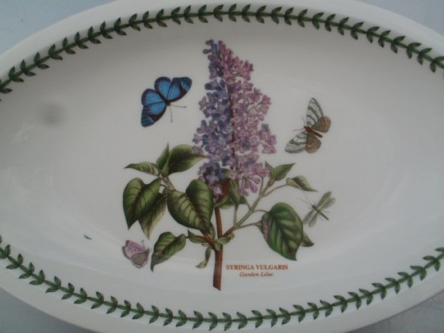 Zdobienie BOTANIC GARDEN ze zdobieniami autorstwa Susan Williams Ellis - tu syringa Vulgaris / garden lilac/ , charakterystyczne motylki i szlaczek. .Sądząc po sygnaturze z dużym prawdopodobieństwem jest to przedmiot z ostatnich edycji.manufaktury w Portmeirion, Dishwasher, microeve, freezer save, oven to table. Jest to przedmiot poza gatunkowy z bez pęknięć I uszczerbków, ale z drobnymi wadami fabrycznymi np. - niewielkie Maźnięcie zieloną farbą / widoczne na zdjęciach /. W pełni użytkowy I bardzo dekoracyjny.