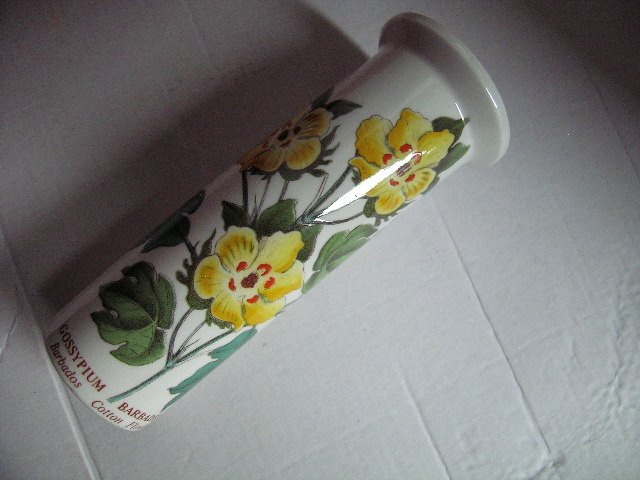 Wazonik porcelanowy z kultowej serii Botanic Garden od Portmeirion - najwyższa jakość i kultowe zdobienia botaniczne od Susan Williams-Ellis. Tu wzór BARBADOS COTTON FLOWER - Gossypium Barbadense - .bardzo rzadko spotykany, zwłaszcza na polskim rynku. Prosta estetyczna forma, żywe,naturalne barwy łyszczące szkliwienie.