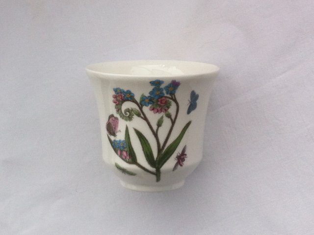Naczynko porcelanowe ze świecą wewnątrz...po wypaleniu jej inaczej użytkowe być może :) śygnowane jakością kultowej serii Portmeirion. Charakterystyczne botaniczne zdobienie niezapominajkowe i motyl pod błyszczącym szkliwieniem. Ciekawy kształt. Dół 3,5; góra 7,5; wys. 7 cm.