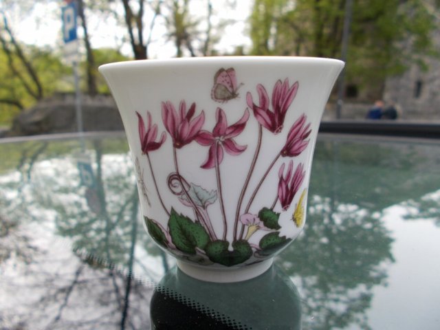 Naczynko porcelanowe ze świecą wewnątrz...po wypaleniu jej inaczej użytkowe być może :) Sygnowane jakością kultowej serii Portmeirion. Charakterystyczne zdobienie autorstwa Susan Williams Ellis Cyklameny jak żywe motyl pod błyszczącym szkliwieniem. Ciekawy kształt. Dół 3,5; góra 7,5; wys. 7 cm.