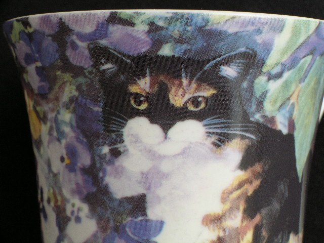Duży porcelanowy kubek, bardzo wygodny, bardzo domowy. Z serii kocich indywidualności na kwietnym parapecie stróżujących :) Ogromna rzadkość na rynku polskim. Sygnowany jakością Pimpernell od Portmeirion. Biała porcelana i akwarelująca artystyczna malatura. Dół 7,5; góra 9,5; szer.12,5; wys.12 cm. Stan zachowania bardzo dobry. Doskonały na oryginalny prezent :)
