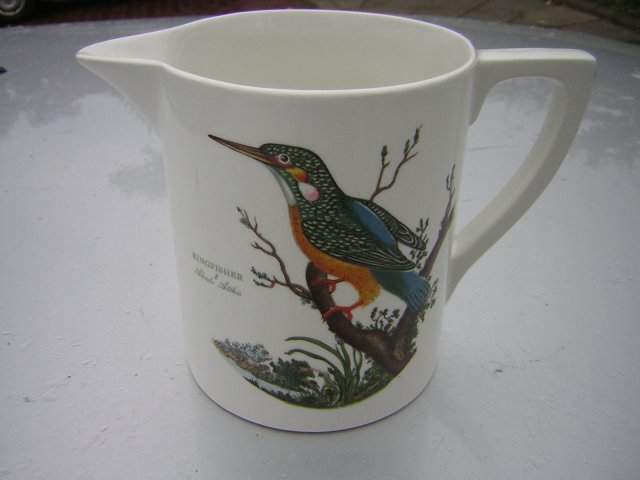 Duży porcelanowy dzbanek. Sygnowany PORTMEIRION BIRDS OF BRITAIN BY E. DONOVAN 1794 SUSAN WILLIAMS ELLIS 1978 DISHWASHER PROOF INGLANZE DECORATION MADE IN ENGLAND. Szlachetna, mocna, dźwięczna porcelana. Ponadczasowa forma. Pojemność odpowiednia na soki, wazon em też być może. Ecru na błyszcząco szkliwione. Wzór ptasi KINGFISHER z jednej BULLFINCH zaś z drugiej w naturalnych, harmonijnych barwach. Wygodne ucho I dziubek. Dekoracyjny, użytkowy. Wartość kolekcjonerska.