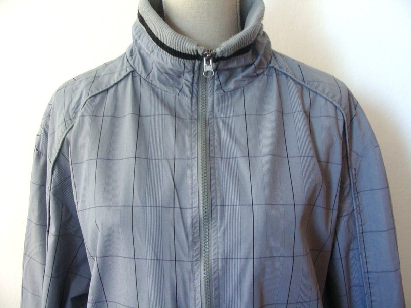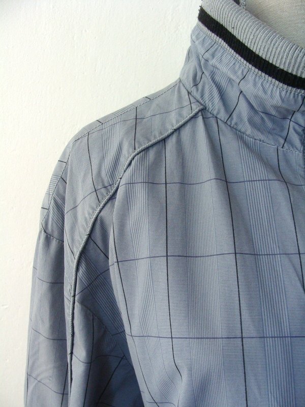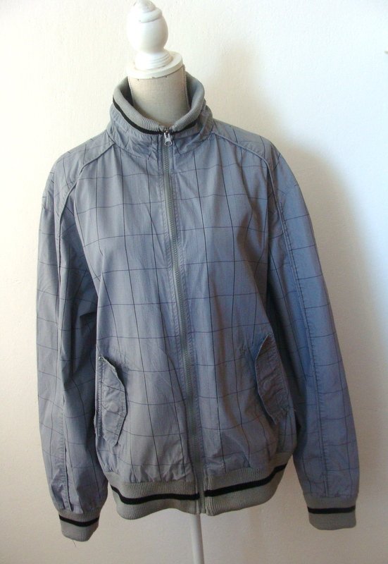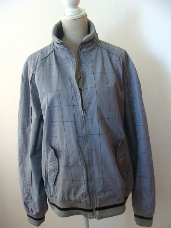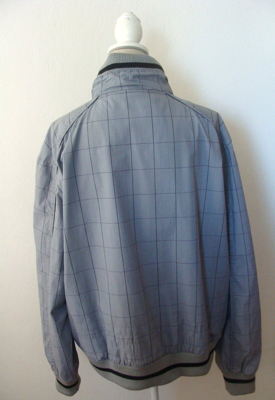 Bawełniana kurtka typu bomber w szaro - czarną kratę, wykończona dzianinowymi ściągaczami. Zapinana na zamek. U dołu dwie wpuszczane kieszeni z patkami zapinanymi na napowy guzik. Całość na podszewce. Moim zdaniem model unisex