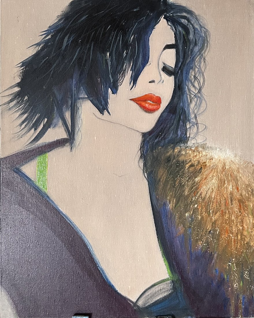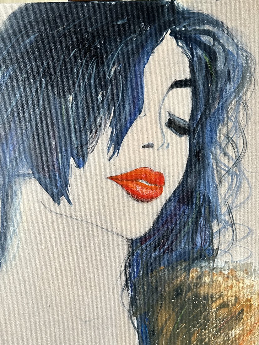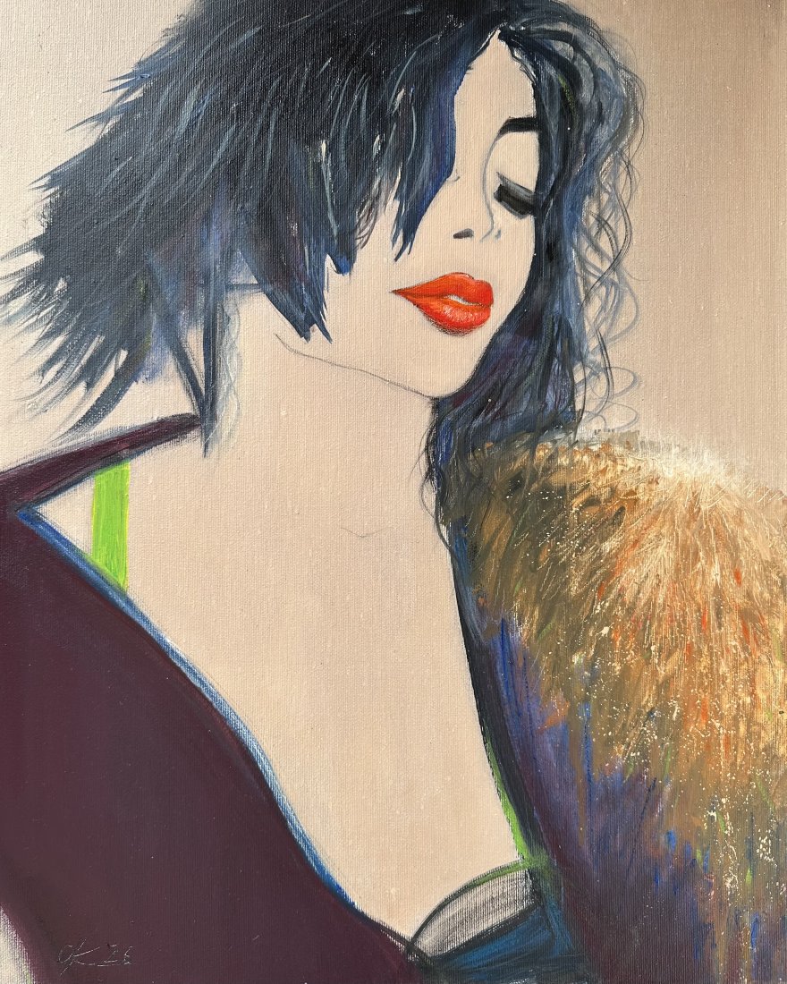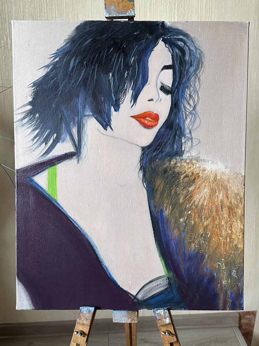 Ten oryginalny obraz olejny ukazuje spokojną intensywność nowoczesnej kobiety — pewnej siebie, enigmatycznej i niezwykle eleganckiej. Jej wyraziste czerwone usta lśnią na tle delikatnej karnacji, a głębokie, niebieskie włosy częściowo skrywają twarz, tworząc atmosferę tajemniczości i wewnętrznej siły.