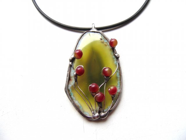 Wisiorek wykonany techniką witrażową z miedzi, cyny, agatu i jadeitów. Zawieszony na czarnej lince kauczukowej o długości ok. 45 cm. Wymiary ok. 6,5 na 3,8 cm.