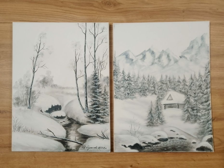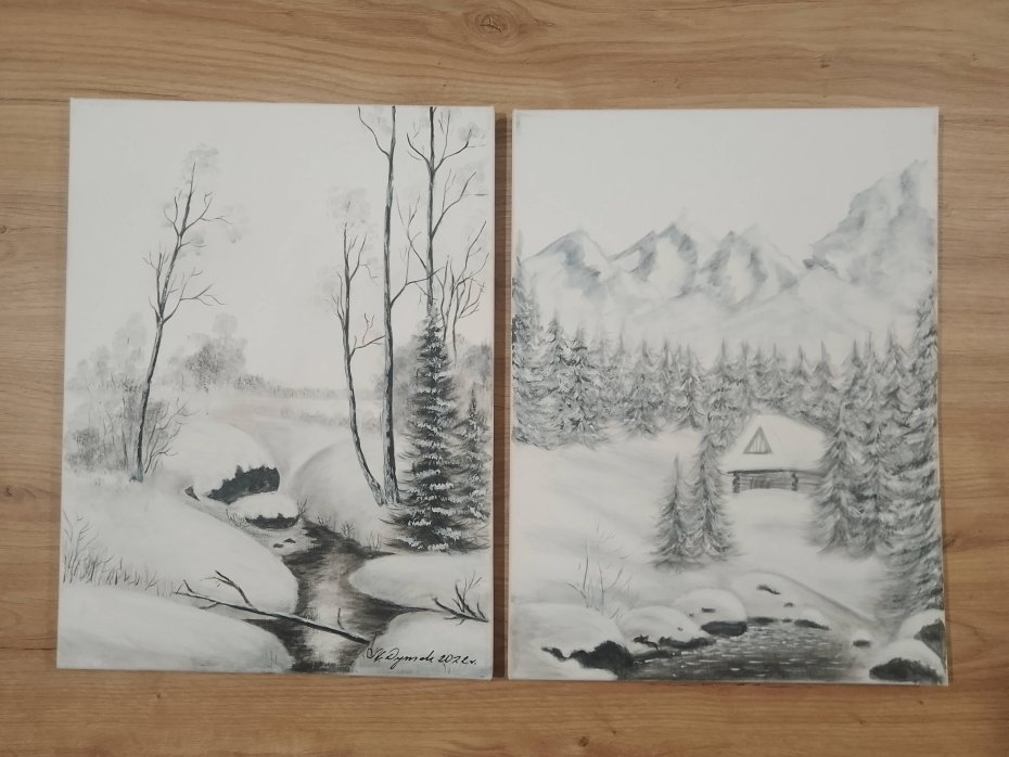 -Tematyka: Ośnieżony gęsty las, strumień oraz przytulna chatka u podnóża gór - zapraszają do chwili wytchnienia i kontemplacji