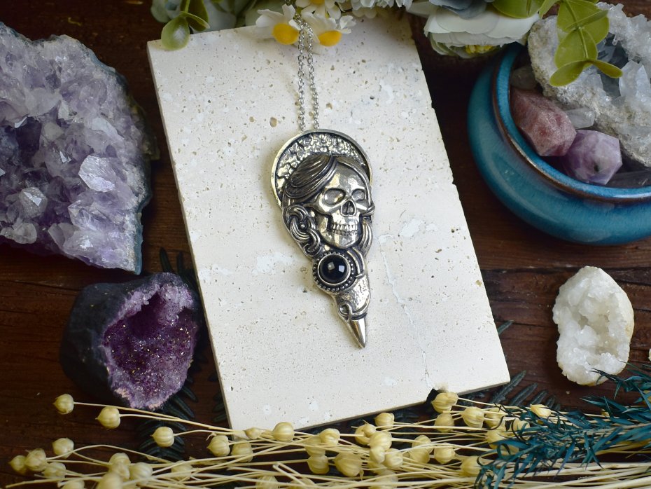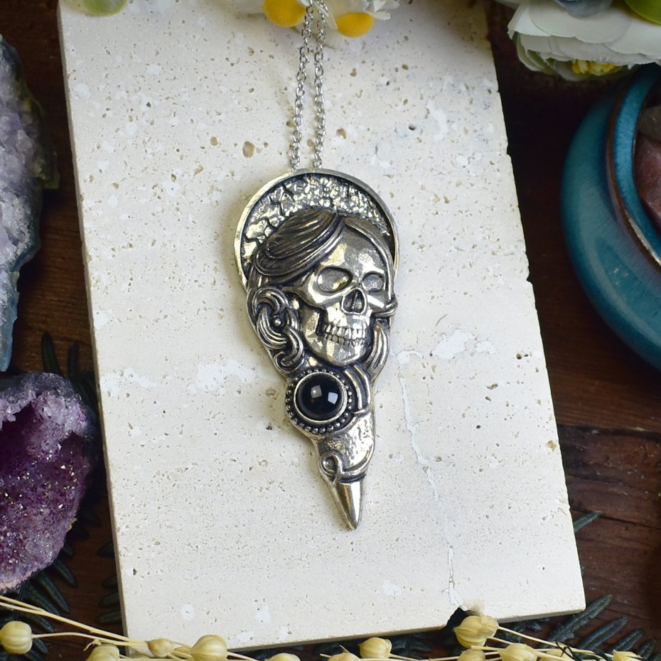 Posrebrzany wisiorek "Martwa Madonna" wykonany z miedzi, pokryty srebrem próby 925, z małym onyksem. Wisiorek przedstawia kobietę-trupa z aureolą, łącząc elementy mistyczne i religijne w jednej kompozycji. Onyks symbolizuje siłę, ochronę i wewnętrzną równowagę, nadając projektowi głębię i tajemniczość. Całość tworzy wyrafinowany i symboliczny wzór, stanowiący refleksję nad miłością, śmiercią i duchowością. Idealny dla osób ceniących unikalne, artystyczne wyrażenie oraz biżuterię o głębokim znaczeniu.
