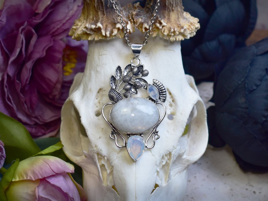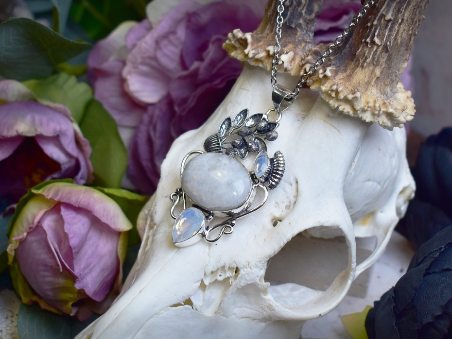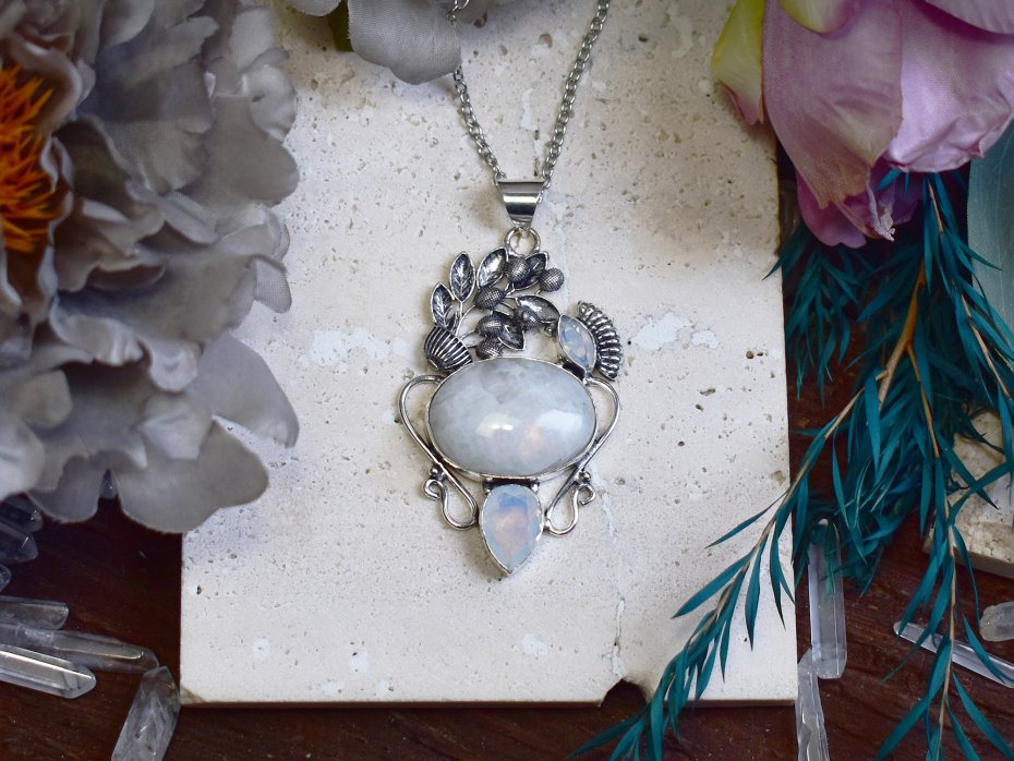 Miedziany wisiorek pokryty srebrem, wykonany tradycyjnymi metodami rzemieślniczymi, ozdobiony dużym kamieniem księżycowym o mlecznej barwie i subtelnym, perłowym połysku. Centralny kamień otaczają drobne opality, które dodają kompozycji delikatnego blasku i lekko eterycznego charakteru. Całość uzupełnia ozdobny motyw roślinny inspirowany liśćmi i pąkami, nadający wisiorkowi organiczny, dekoracyjny wygląd. Płynne linie oprawy i starannie dopracowane detale tworzą harmonijną formę, w której naturalność kamieni łączy się z elegancją. Kamień księżycowy kojarzony jest z intuicją, spokojem i równowagą emocjonalną, a jasna kolorystyka w połączeniu ze srebrzystym wykończeniem nadaje biżuterii łagodny, ponadczasowy charakter. To wyjątkowy wisiorek dla osób ceniących rękodzieło, roślinne motywy i subtelną, romantyczną estetykę.