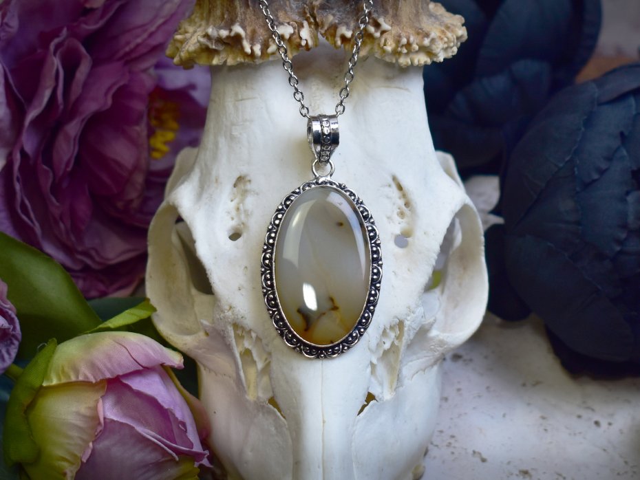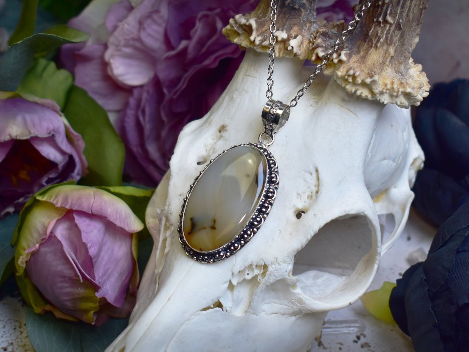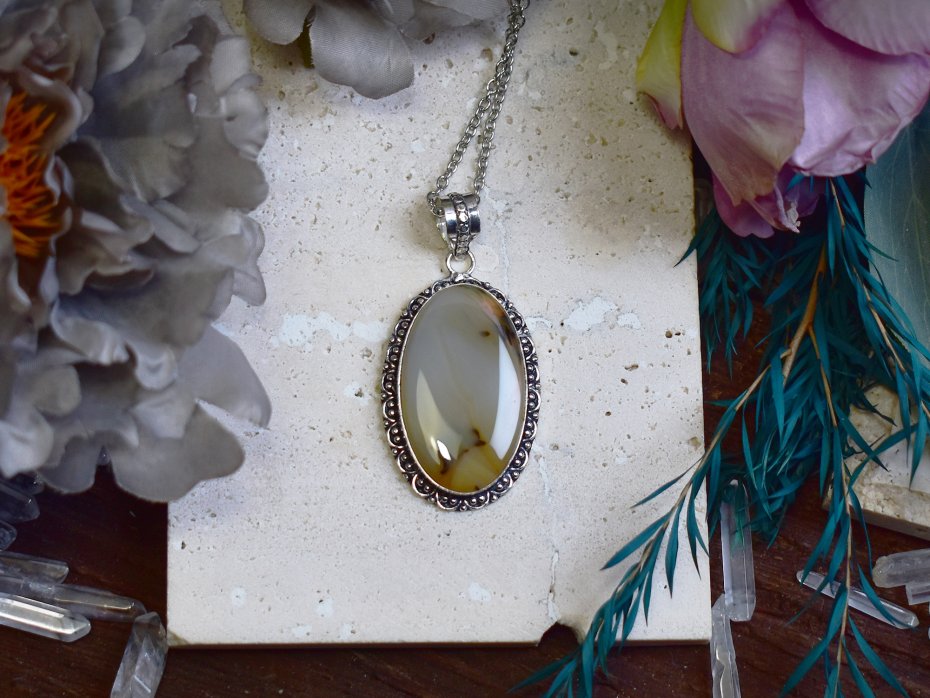 Miedziany wisiorek pokryty srebrem, wykonany tradycyjnymi metodami rzemieślniczymi, ozdobiony agatem Montana o kremowej, subtelnej barwie. Kamień wyróżnia się delikatnymi, naturalnymi wzorami i spokojną kolorystyką, która nadaje biżuterii lekkości i ponadczasowej elegancji. Prosta oprawa pozwala w pełni wyeksponować naturalne piękno minerału, podkreślając jego minimalistyczny charakter. Agat Montana kojarzony jest z równowagą, wyciszeniem i stabilnością, sprzyjając spokojowi i harmonii. Chłodne, srebrzyste wykończenie miedzi w połączeniu z kremowym odcieniem kamienia tworzy stonowany, wyrafinowany wisiorek idealny dla osób ceniących subtelną biżuterię, rękodzieło i naturalne kamienie.