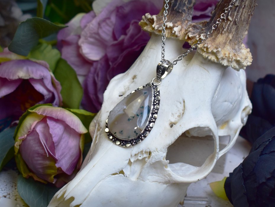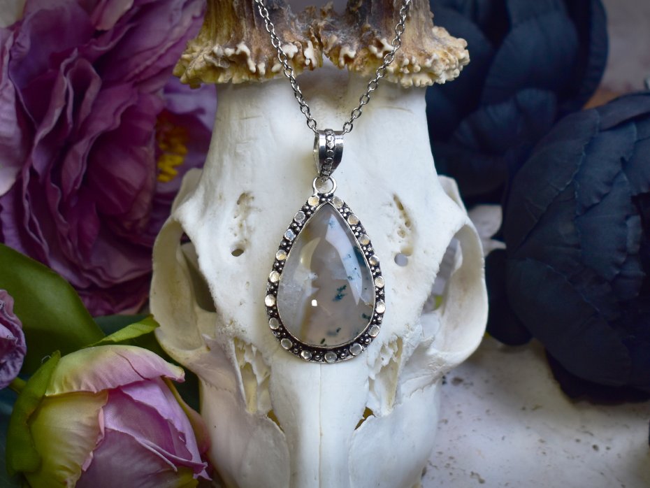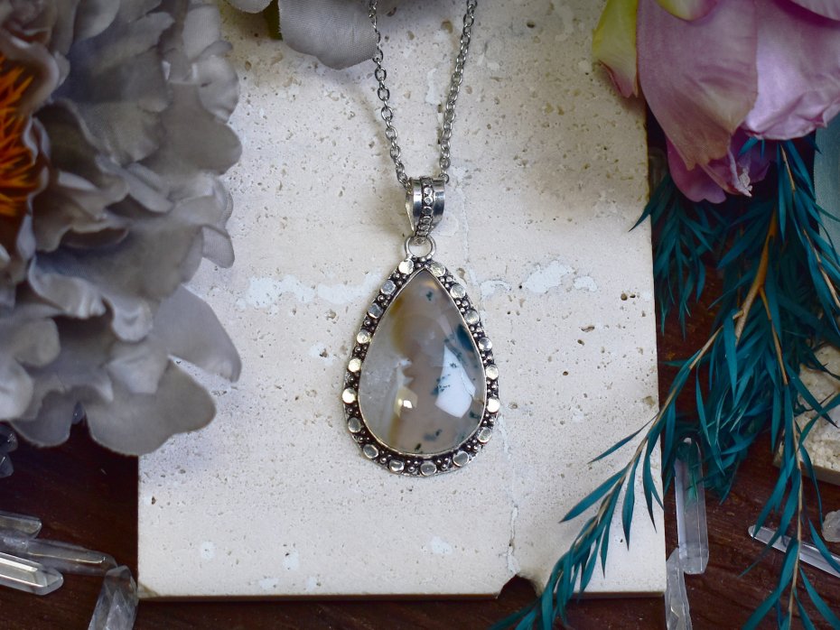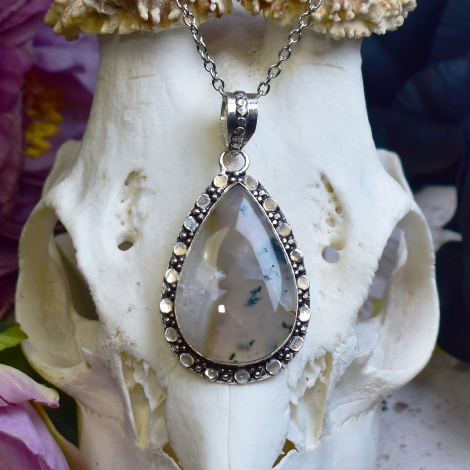 Miedziany wisiorek pokryty srebrem, wykonany tradycyjnymi metodami rzemieślniczymi, ozdobiony agatem mszystym. Kamień zachwyca naturalnym rysunkiem przypominającym roślinne formy, w odcieniach zieleni, bieli i delikatnych ziemistych tonów. Prosta, elegancka oprawa pozwala w pełni wyeksponować unikatowy wzór minerału, nadając biżuterii ponadczasowy i subtelny charakter. Agat mszysty kojarzony jest z harmonią, połączeniem z naturą oraz wewnętrzną równowagą. Chłodne, srebrzyste wykończenie pięknie współgra z organicznym wyglądem kamienia, tworząc spokojny i wyrafinowany wisiorek dla osób ceniących minimalizm, rękodzieło i naturalne kamienie.