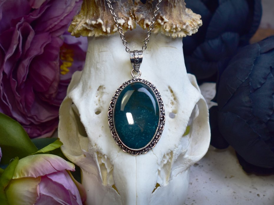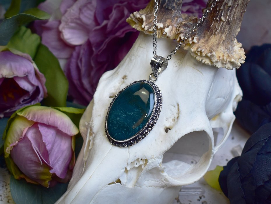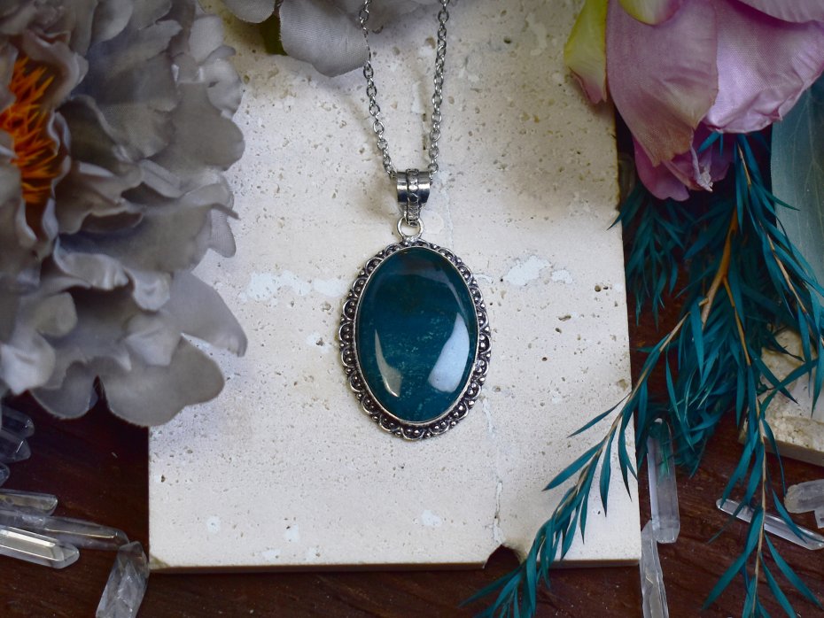 Miedziany wisiorek pokryty srebrem, wykonany tradycyjnymi metodami rzemieślniczymi, ozdobiony agatem mszystym. Kamień zachwyca naturalnym rysunkiem przypominającym roślinne formy, w odcieniach zieleni, bieli i delikatnych ziemistych tonów. Prosta, elegancka oprawa pozwala w pełni wyeksponować unikatowy wzór minerału, nadając biżuterii ponadczasowy i subtelny charakter. Agat mszysty kojarzony jest z harmonią, połączeniem z naturą oraz wewnętrzną równowagą. Chłodne, srebrzyste wykończenie pięknie współgra z organicznym wyglądem kamienia, tworząc spokojny i wyrafinowany wisiorek dla osób ceniących minimalizm, rękodzieło i naturalne kamienie.