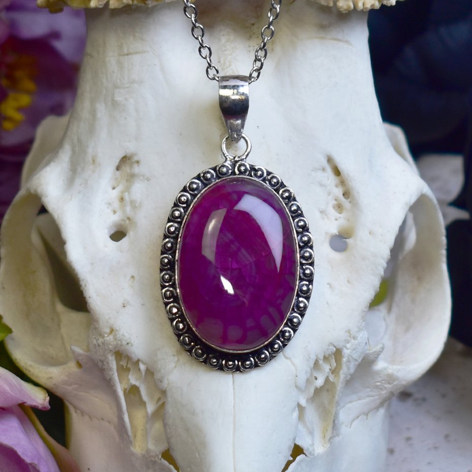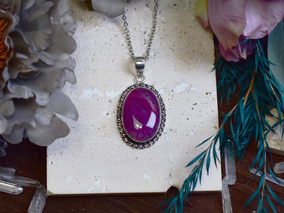 Miedziany wisiorek wykonany tradycyjnymi metodami rzemieślniczymi, ozdobiony różowym agatem solarnym o charakterystycznej, promienistej strukturze. Kamień zachwyca miękką paletą różowych odcieni oraz naturalnym, koncentrycznym rysunkiem, który nadaje mu wyjątkową głębię i dekoracyjny charakter. Prosta, elegancka oprawa pozwala wyeksponować unikatowy wzór minerału, podkreślając jego naturalne piękno. Różowy agat solarny kojarzony jest z harmonią, spokojem i łagodną energią, sprzyjając równowadze emocjonalnej oraz poczuciu ciepła i stabilności. Połączenie delikatnej kolorystyki kamienia z ciepłym odcieniem miedzi tworzy wisiorek o subtelnym, a jednocześnie wyrazistym charakterze — idealny dla osób ceniących rękodzieło i naturalne, niepowtarzalne minerały.