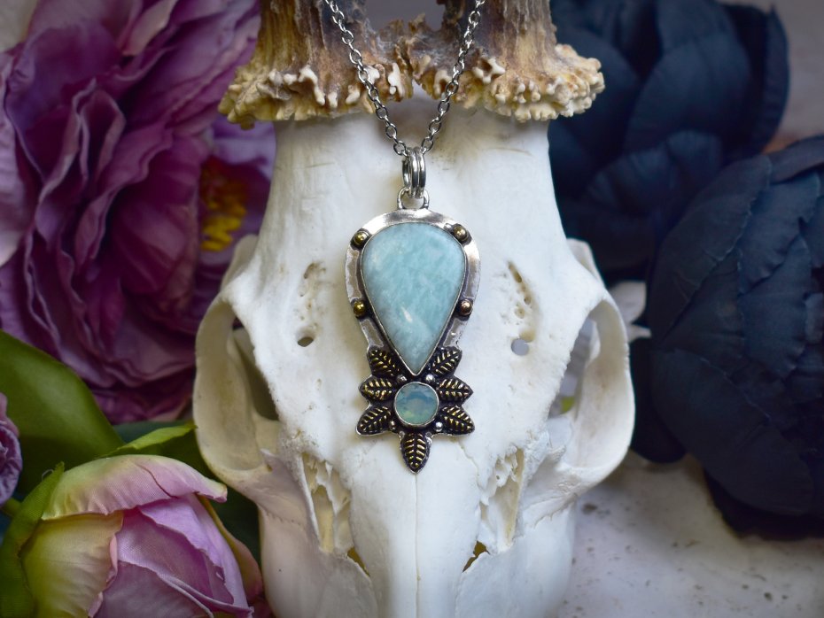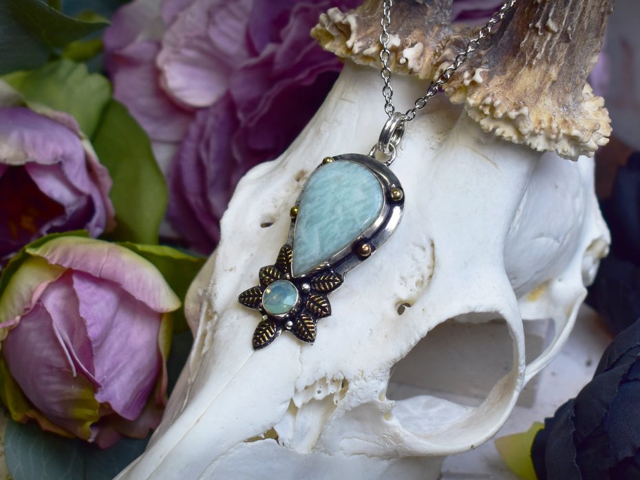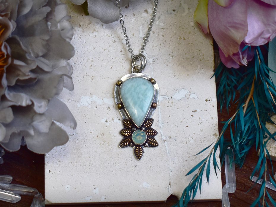 Wisiorek wykonany ze srebrnej blachy, ręcznie formowany tradycyjnymi metodami rzemieślniczymi, ozdobiony dużym amazonitem o delikatnej, zielono-błękitnej barwie oraz mniejszym chalcedonem umieszczonym w dolnej części kompozycji. Oprawę uzupełniają dekoracyjne kulki i listki z mosiądzu, które wprowadzają ciepły, złotawy akcent i subtelnie kontrastują z chłodnym odcieniem srebra. Naturalna kolorystyka kamieni w połączeniu z roślinnymi detalami tworzy harmonijną, elegancką całość o organicznym charakterze. Amazonit kojarzony jest z równowagą i spokojem, natomiast chalcedon z łagodnością i harmonią wewnętrzną. Zestawienie srebra, mosiądzu i naturalnych kamieni nadaje wisiorkowi wyrazisty, a jednocześnie ponadczasowy styl, idealny dla osób ceniących rękodzieło i biżuterię inspirowaną naturą.