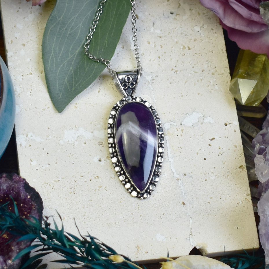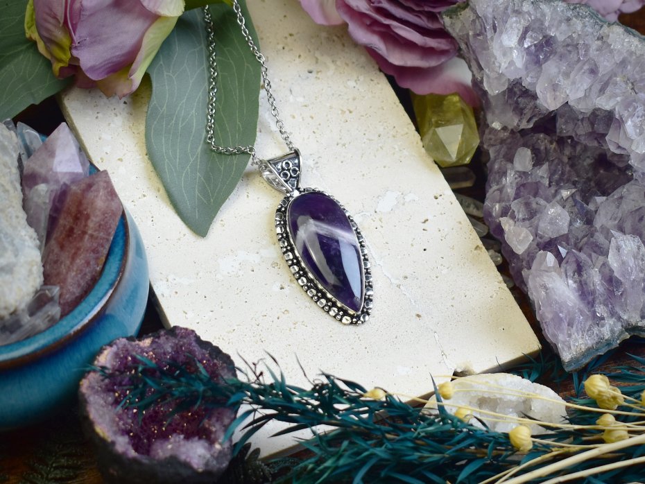 Wisiorek wykonany z miedzi, posrebrzany tradycyjnymi technikami, ozdobiony ametystem – kamieniem, który symbolizuje spokój, równowagę i ochronę. Ametyst od wieków uznawany jest za kamień mądrości, wspomagający koncentrację i intuicję. Dzięki połączeniu miedzi i srebra, wisiorek zyskuje elegancki, ale subtelny charakter. Idealny dla osób szukających nie tylko pięknej ozdoby, ale także talizmanu, który wspiera duchowy rozwój i zapewnia harmonię.