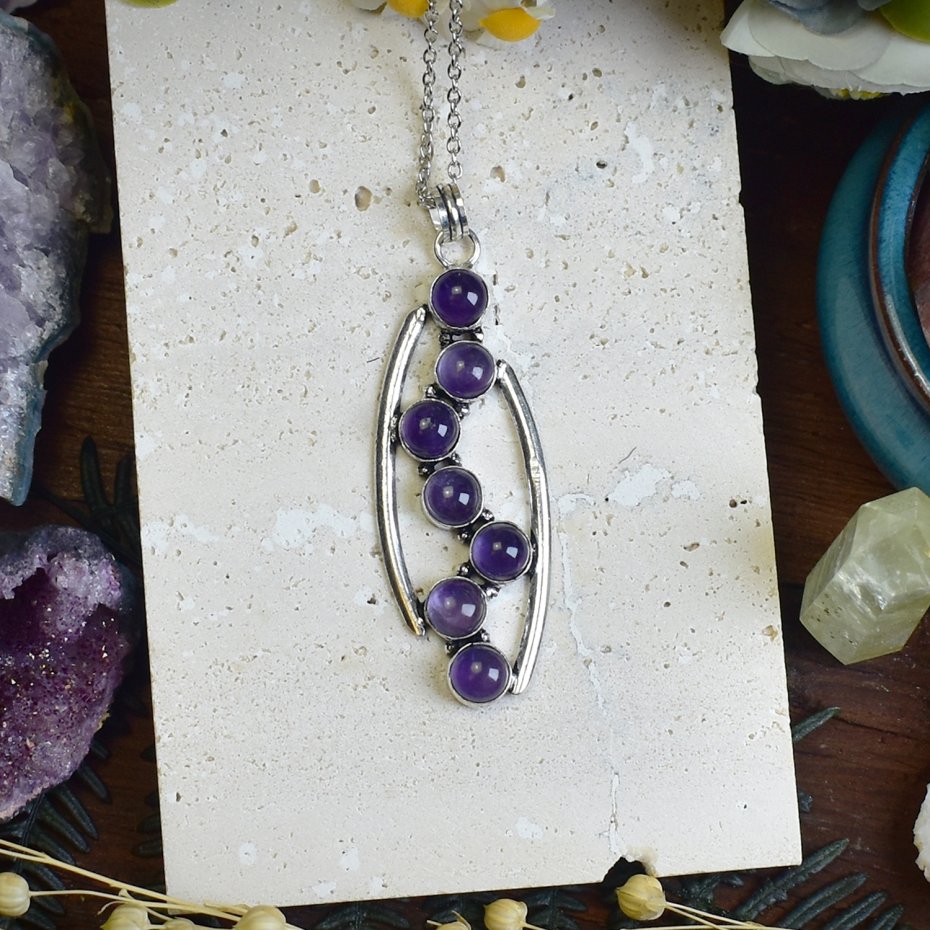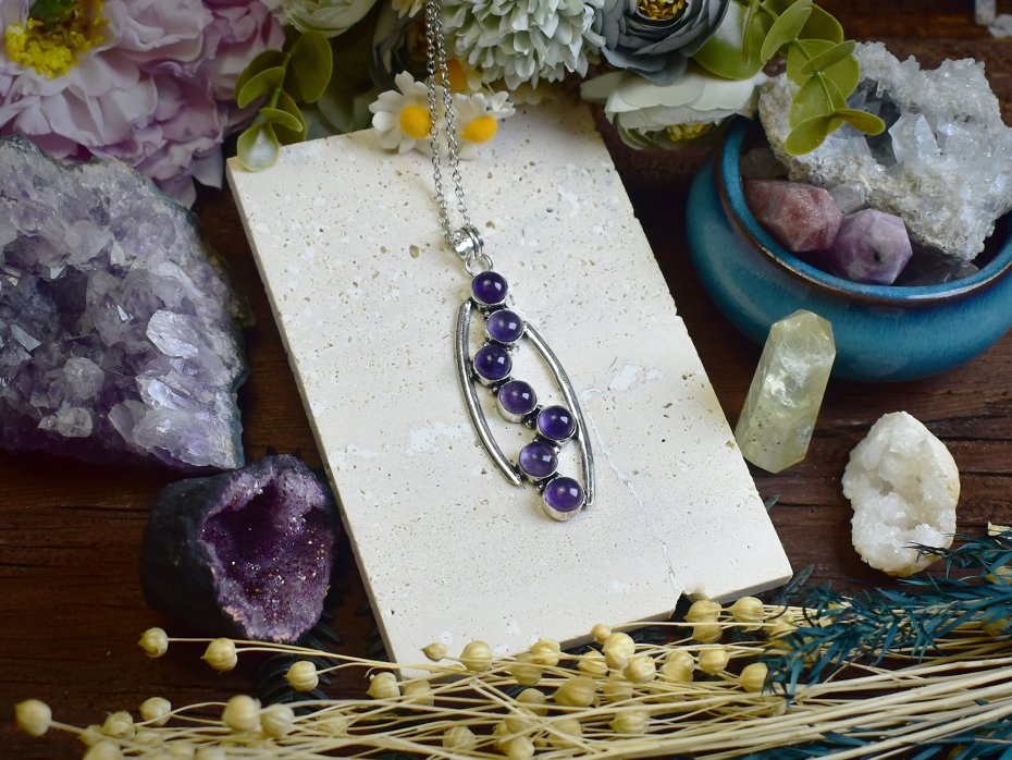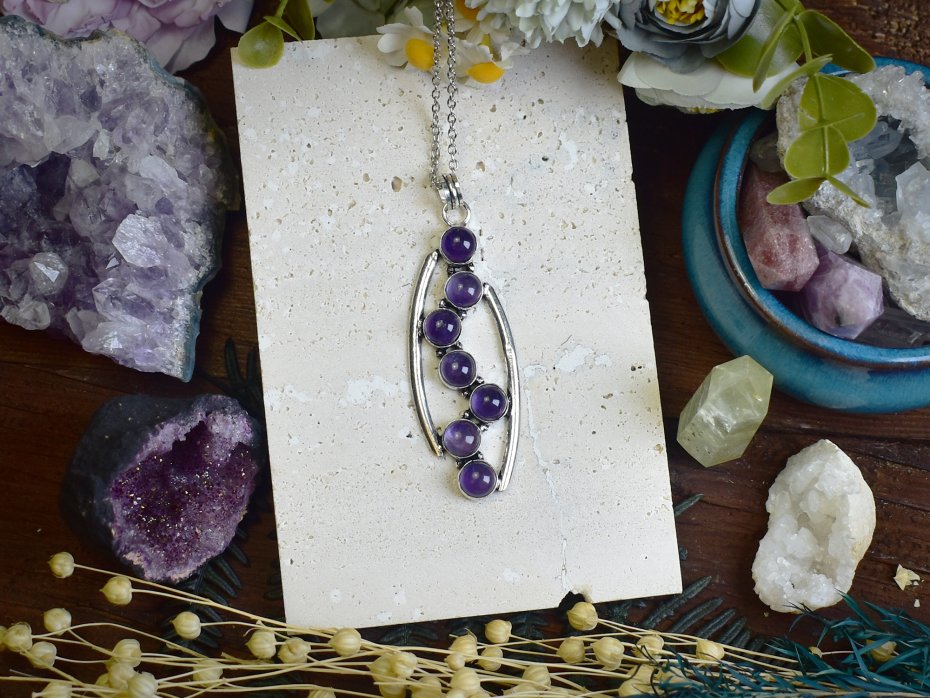 Wisiorek wykonany z miedzi, posrebrzany tradycyjną metodą. W centralnej części znajduje się ametyst, kamień o głębokim fioletowym odcieniu, który od wieków uznawany jest za symbol spokoju i duchowego oczyszczenia. Ametyst wspomaga równowagę emocjonalną, pomaga w medytacji i uspokaja umysł. Posrebrzany finish nadaje biżuterii elegancji i nowoczesnego charakteru, tworząc subtelne połączenie klasyki z odrobiną współczesnej elegancji.