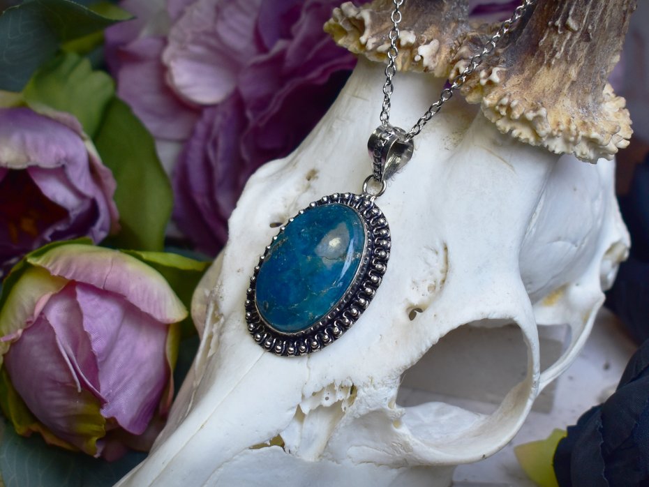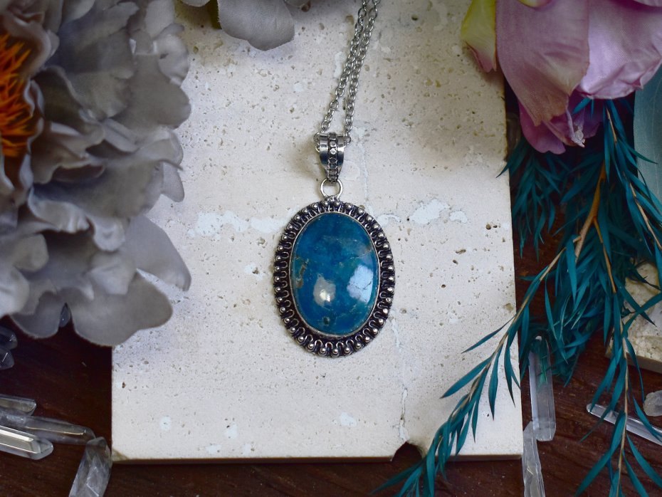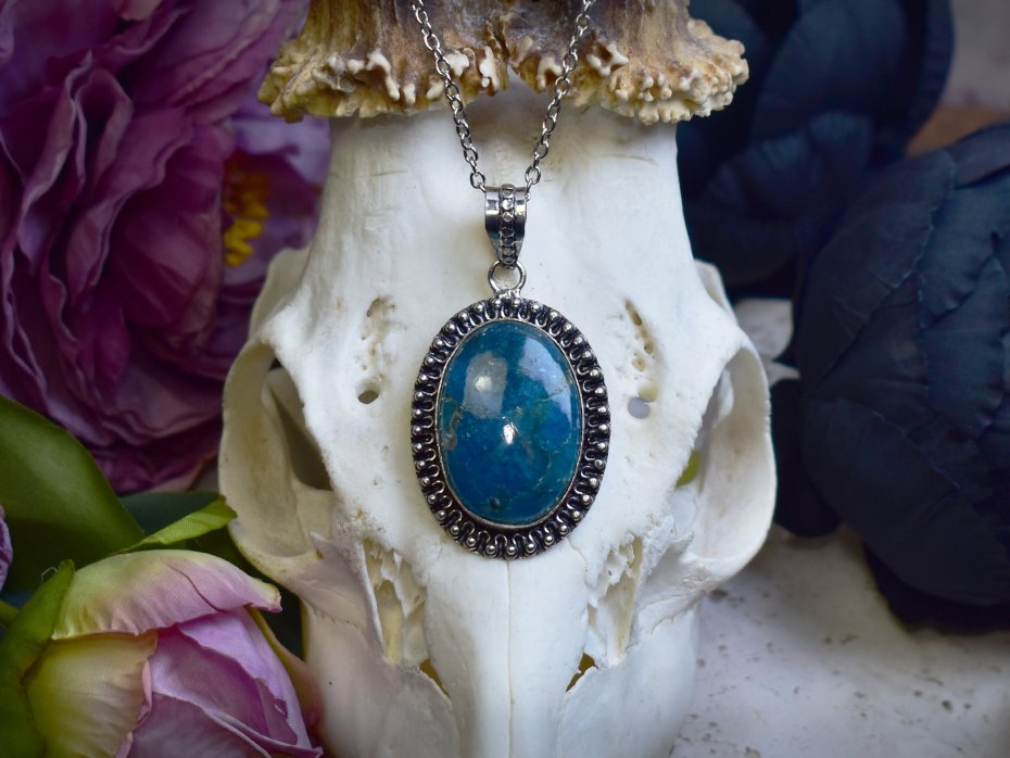 Miedziany wisiorek wykonany tradycyjnymi metodami rzemieślniczymi, ozdobiony apatytetem o intensywnej, głębokiej barwie z delikatnym, naturalnym połyskiem. Kamień przyciąga uwagę swoją wyrazistą kolorystyką, nadając biżuterii świeżości i lekkości. Prosta, elegancka forma oprawy pozwala w pełni wyeksponować naturalne piękno minerału i jego energetyczny charakter. Apatyt kojarzony jest z inspiracją, jasnością myśli i motywacją, wspierając kreatywność oraz wewnętrzną równowagę. Ciepły odcień miedzi harmonijnie współgra z chłodną tonacją kamienia, tworząc elegancki, ponadczasowy wisiorek dla osób ceniących rękodzieło, naturalne kamienie i biżuterię o subtelnym, a zarazem wyrazistym charakterze.
