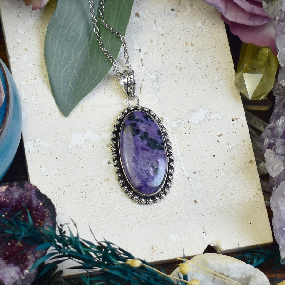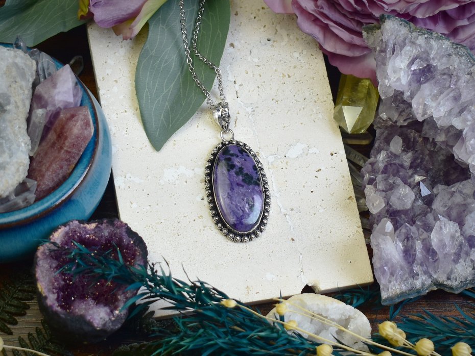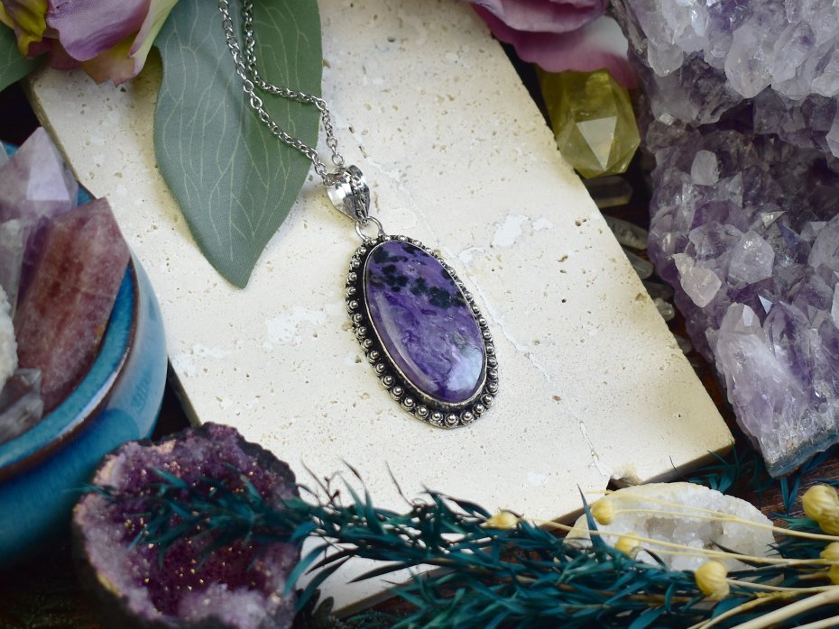 Miedziany posrebrzany wisiorek z charoitem to połączenie tradycyjnego rzemiosła i niepowtarzalnego uroku kamienia. Charoit, o intensywnej purpurowej barwie, uważany jest za kamień transformacji i duchowego uzdrowienia. Wisiorek wykonany z miedzi, a następnie posrebrzony, zyskuje subtelną elegancję, która doskonale podkreśla wyjątkowy charakter charoitu. To doskonały wybór dla osób szukających unikalnej biżuterii o głębokim, duchowym znaczeniu.
