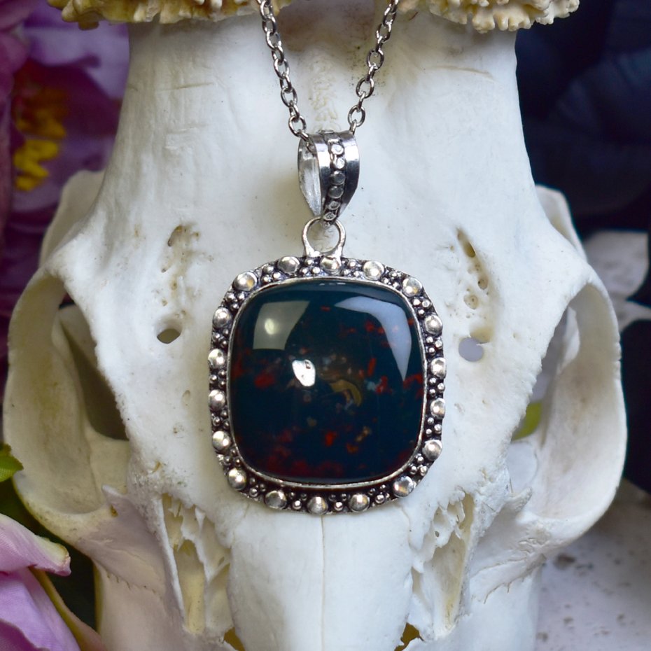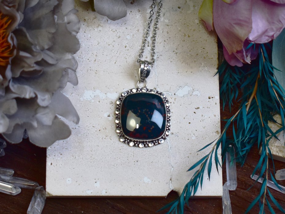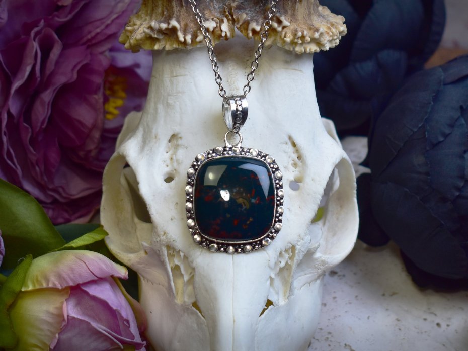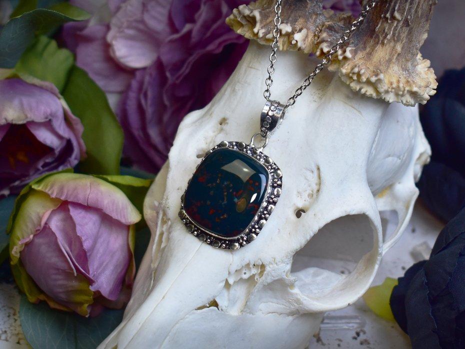 Miedziany wisiorek wykonany tradycyjnymi metodami rzemieślniczymi, ozdobiony heliotropem, znanym również jako bloodstone. Kamień wyróżnia się głęboką, zieloną barwą z charakterystycznymi czerwonymi inkluzjami, które nadają mu wyrazisty i szlachetny wygląd. Prosta, klasyczna oprawa podkreśla naturalny rysunek minerału i pozwala w pełni wyeksponować jego unikatowy charakter. Heliotrop od wieków kojarzony jest z siłą, ochroną i witalnością, sprzyjając wewnętrznej stabilności i odwadze. Połączenie naturalnej kolorystyki kamienia z ciepłym odcieniem miedzi tworzy elegancki, ponadczasowy wisiorek dla osób ceniących rękodzieło, naturalne minerały i biżuterię o symbolicznym znaczeniu.