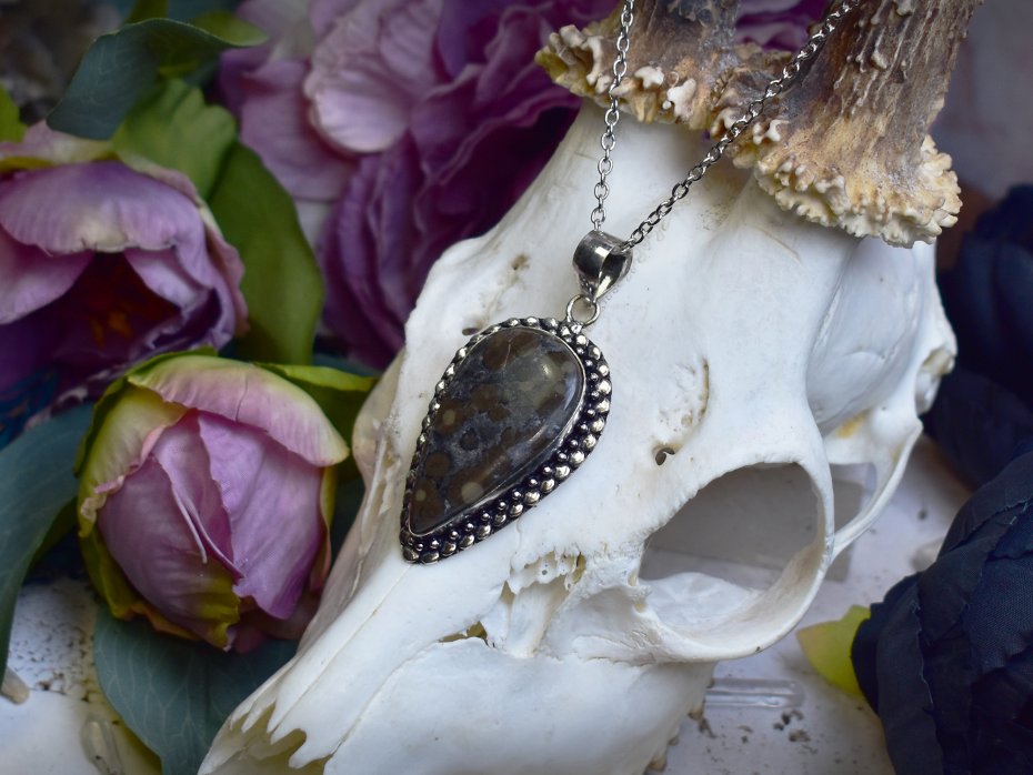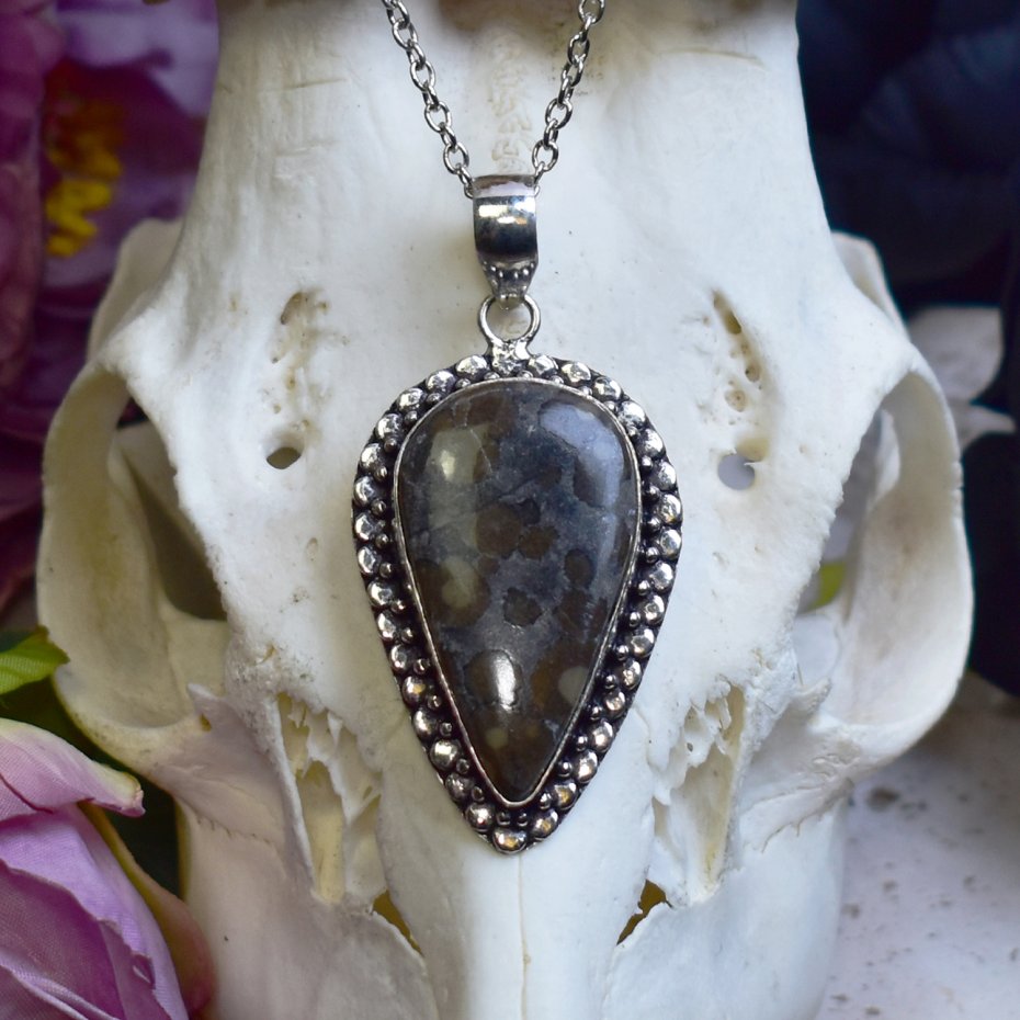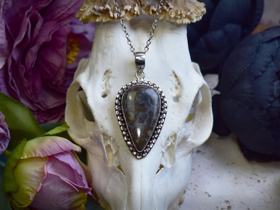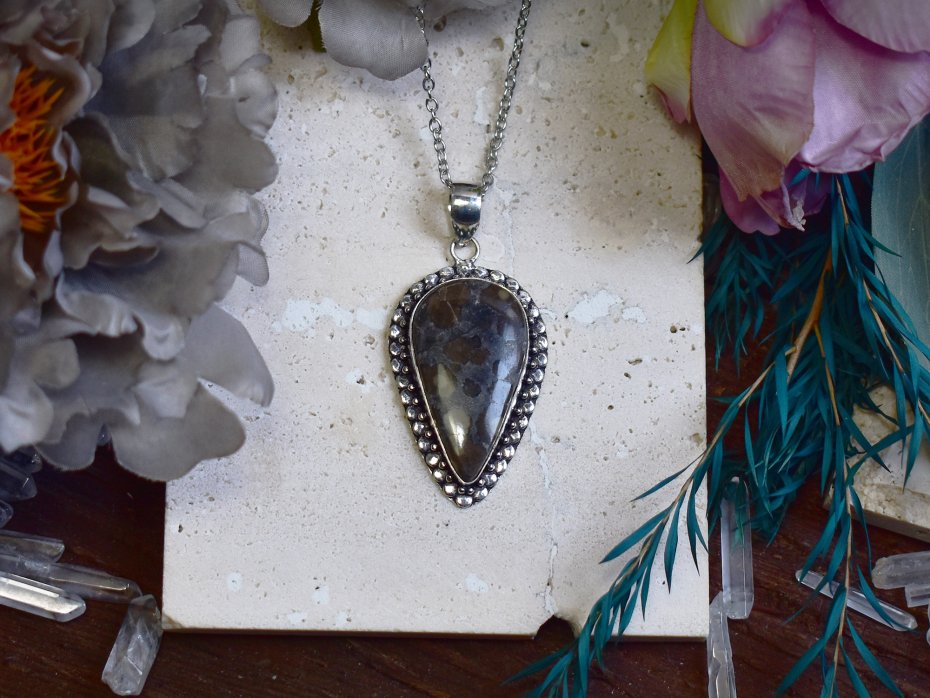 Miedziany wisiorek pokryty srebrem, wykonany tradycyjnymi metodami rzemieślniczymi, ozdobiony jaspisem z naturalnymi inkluzjami markasytu. Kamień wyróżnia się chłodną, szarą barwą z nieregularnie rozmieszczonymi brązowo-oliwkowymi plamkami, które nadają mu surowy, organiczny charakter. Naturalny rysunek minerału sprawia, że każdy egzemplarz jest unikatowy. Prosta, elegancka oprawa pozwala w pełni wyeksponować strukturę kamienia, podkreślając jego minimalistyczny i ponadczasowy wygląd. Jaspis z inkluzjami markasytu kojarzony jest z ugruntowaniem, stabilnością i ochroną, sprzyjając skupieniu oraz wewnętrznej równowadze. Połączenie chłodnego, srebrzystego wykończenia z subtelną kolorystyką kamienia tworzy wisiorek o spokojnym, surowym i wyrafinowanym wyrazie, idealny dla miłośników naturalnych minerałów i rękodzieła.