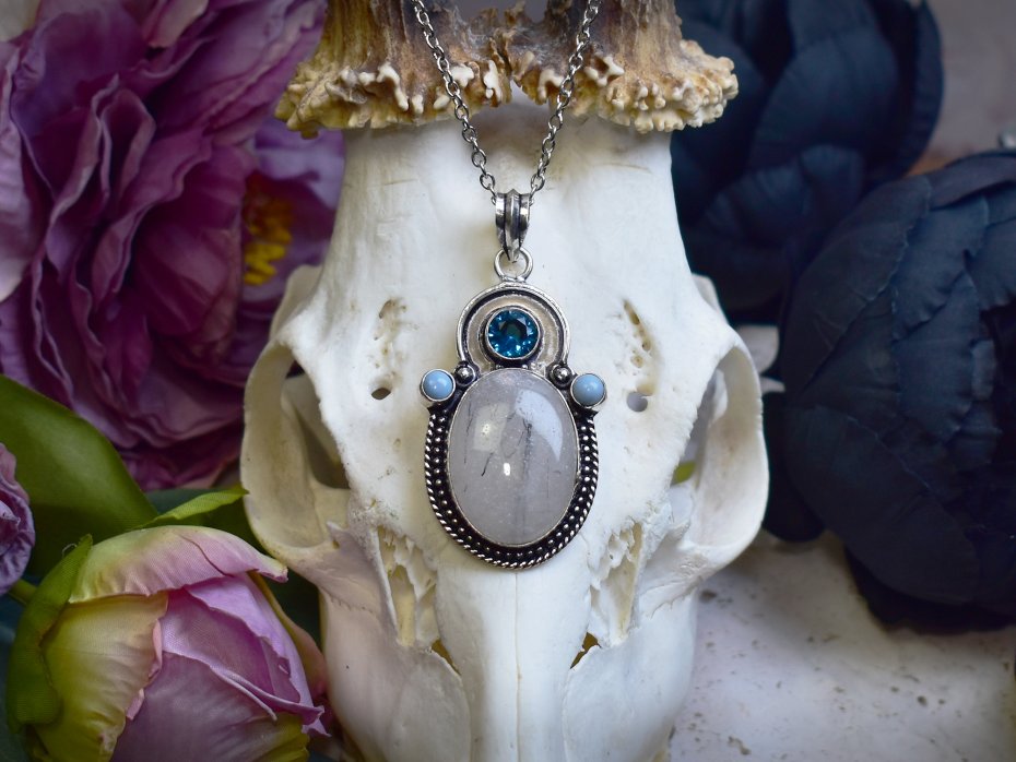 Wisiorek wykonany ze srebrnej blachy, ręcznie formowany tradycyjnymi metodami rzemieślniczymi, ozdobiony kwarcem z czarnym rutylem o jasnej, półprzezroczystej strukturze i delikatnych, naturalnych inkluzjach. Centralny kamień uzupełnia syntetyczny topaz w intensywnie niebieskim odcieniu, umieszczony w górnej części kompozycji, oraz drobne niebieskie opale, które wprowadzają subtelny, mleczny połysk i równoważą całość kolorystycznie. Starannie dopracowana oprawa z ozdobnym rantem podkreśla elegancki, a jednocześnie lekko artystyczny charakter wisiorka. Zestawienie chłodnych tonów kamieni tworzy harmonijną, spokojną kompozycję o wyrafinowanym wyglądzie. Kwarc z rutylem kojarzony jest z klarownością i koncentracją, a niebieskie akcenty dodają biżuterii lekkości i świeżości. To wisiorek dla osób ceniących rękodzieło, naturalne kamienie i elegancką biżuterię z subtelnym detalem.