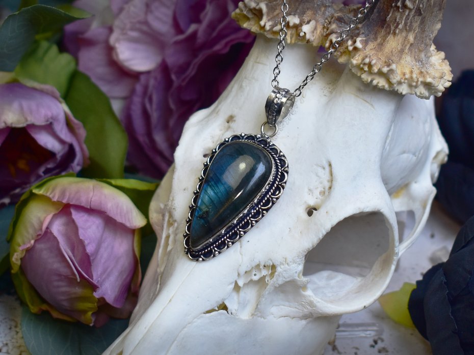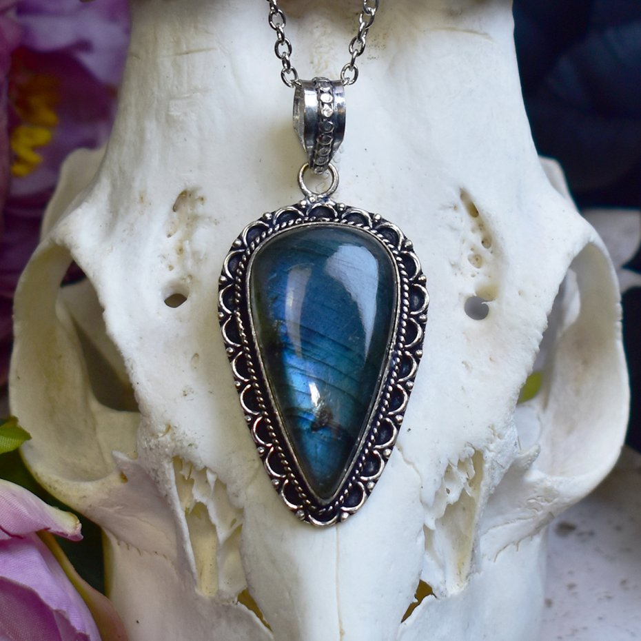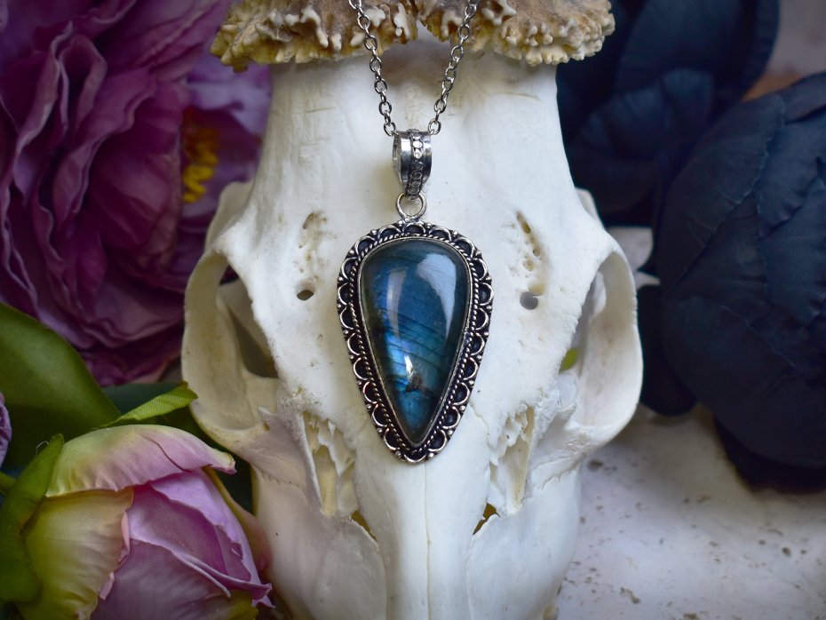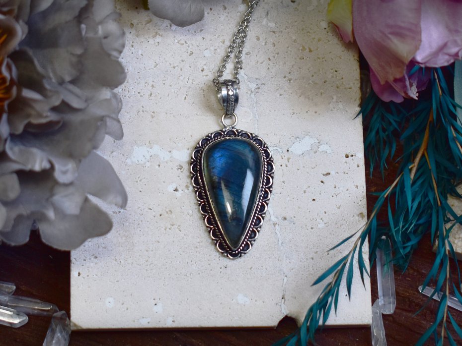 Miedziany wisiorek pokryty srebrem, wykonany tradycyjnymi metodami rzemieślniczymi, ozdobiony labradorytem o intensywnym, niebieskim połysku. Kamień przyciąga uwagę swoją głębią i zmiennym światłem, które nadaje biżuterii wyjątkowy, niemal eteryczny charakter. Prosta, elegancka oprawa podkreśla naturalne piękno labradorytu i pozwala w pełni wyeksponować jego barwę. Labradoryt kojarzony jest z ochroną, intuicją i wewnętrzną równowagą, sprzyjając koncentracji i wyciszeniu. Chłodne, srebrzyste wykończenie miedzi harmonijnie współgra z błękitem kamienia, tworząc ponadczasowy wisiorek o subtelnie mistycznym i eleganckim wyrazie, idealny dla miłośników rękodzieła i naturalnych kamieni.