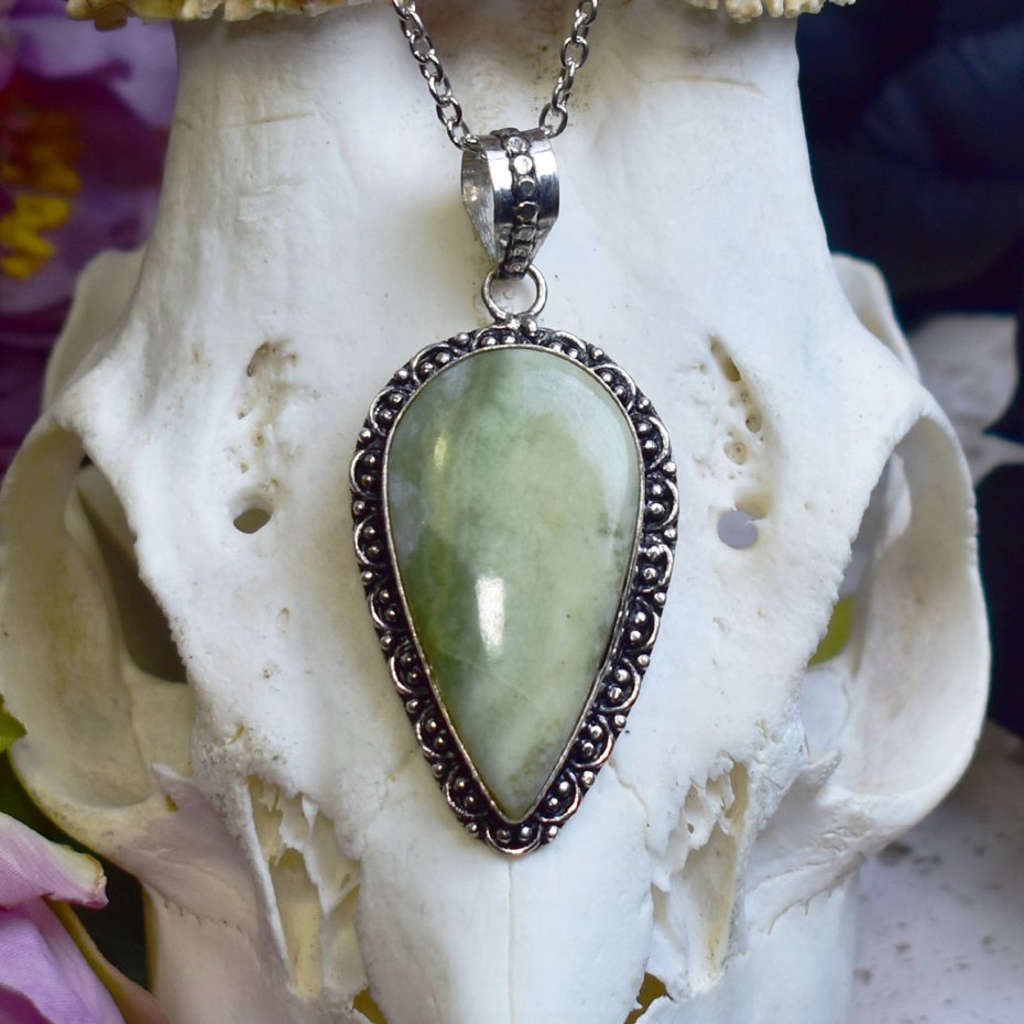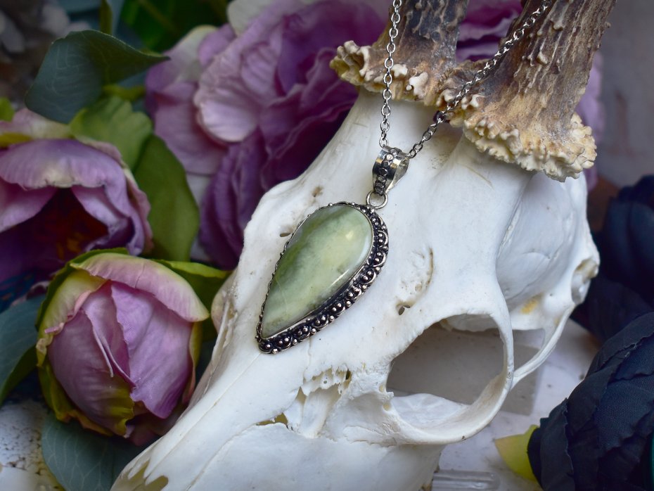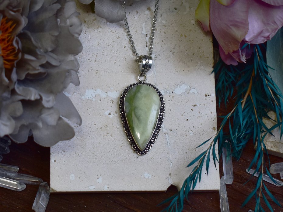 Miedziany wisiorek pokryty srebrem, wykonany tradycyjnymi metodami rzemieślniczymi, ozdobiony larsonitem. Kamień wyróżnia się jasną, kremowo-szarą barwą z delikatnymi, naturalnymi żyłkami, które nadają mu spokojny i subtelny charakter. Prosta, elegancka oprawa pozwala w pełni wyeksponować naturalne piękno minerału, tworząc biżuterię o ponadczasowym i stonowanym wyrazie. Larsonit kojarzony jest z równowagą, wyciszeniem i harmonią, sprzyjając wewnętrznemu spokojowi i klarowności myśli. Połączenie chłodnego, srebrzystego wykończenia z delikatną kolorystyką kamienia tworzy minimalistyczny wisiorek dla osób ceniących rękodzieło, naturalne materiały i spokojną elegancję.